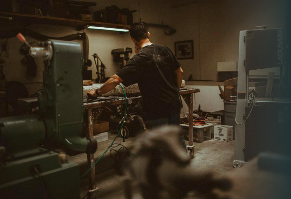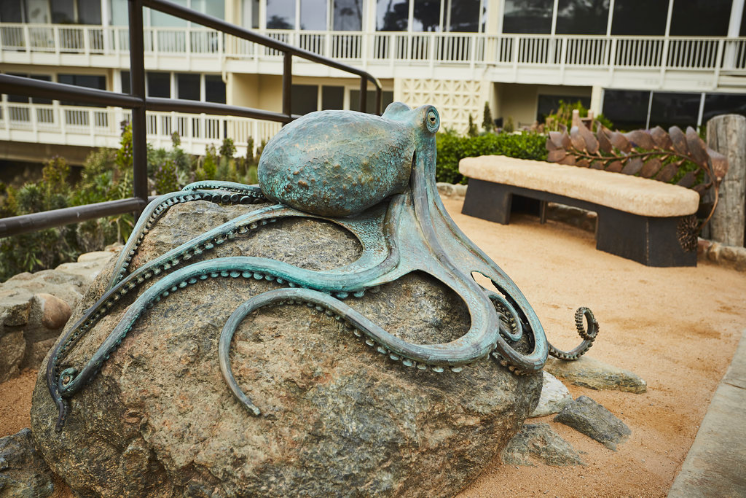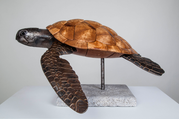 With the natural world as a never-ending source of inspiration and subject matter, Casey uses a wide variety of materials and techniques when he’s working to capture the real-life characteristics of a plant or animal. He chooses from different species of wood in an effort to have the piece resemble as much as possible the natural patterns, colors, and textures of the subject matter. The wavy pattern in curly redwood, for example, is similar to the stripes of a tiger shark, and a large manzanita burl may give way to an octopus once the wood around it is carved away.