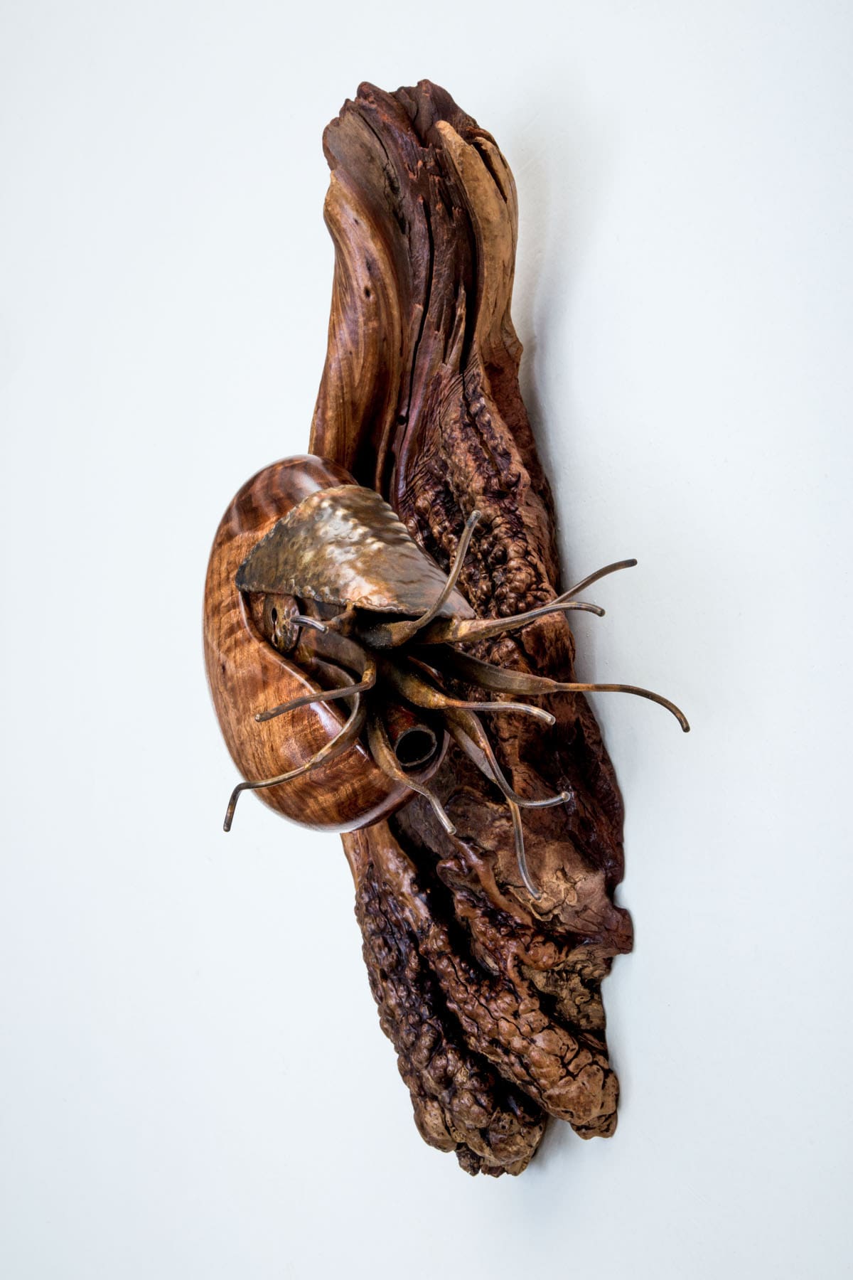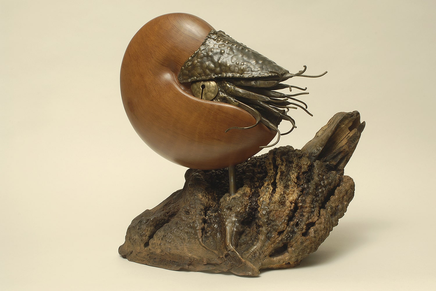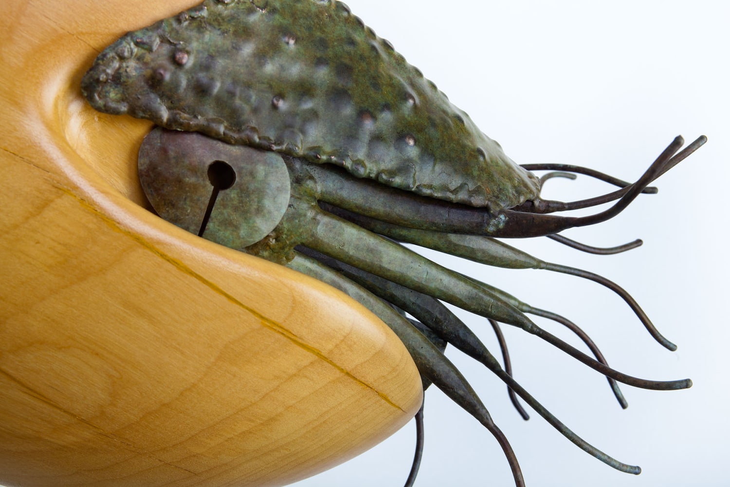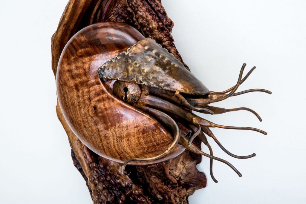 Considered living fossils, nautiluses are ancient (and shelled) relatives of squid. Within a nautilus shell is a series of sealed chambers, each filled with gas. The nautilus injects fluid into the chambers (or removes it) to obtain and then maintain neutral buoyancy. The shell of Ancient Mariner is carved out of a wood like curly redwood or black acacia that reflects the appearance of a nautilus’s natural shell. The body of the nautilus is forged and welded of bronze.