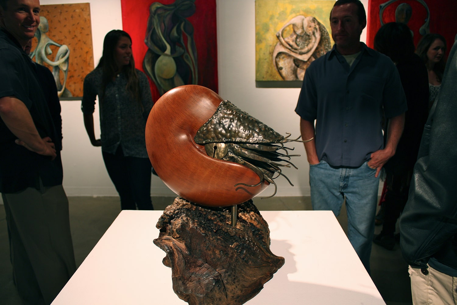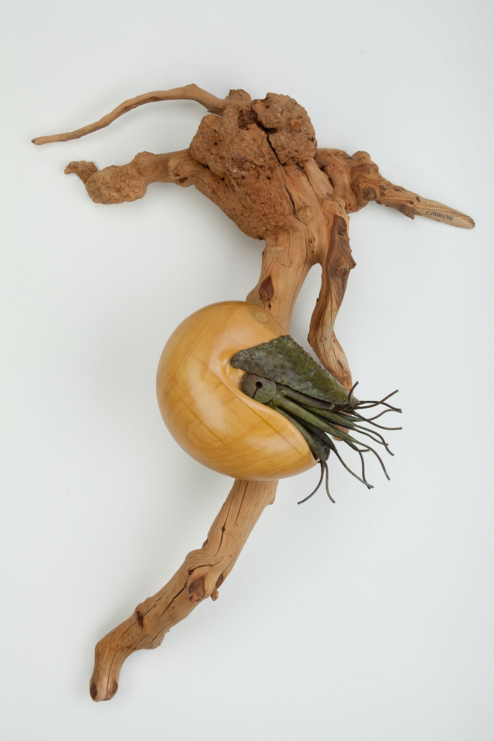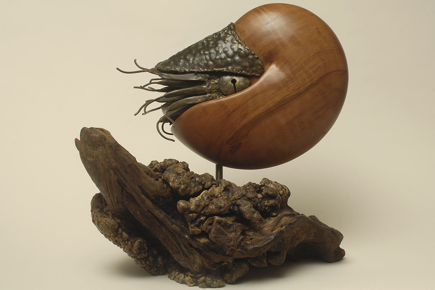 Considered living fossils, nautiluses are ancient (and shelled) relatives of squid. Within a nautilus shell is a series of sealed chambers, each filled with gas. The nautilus injects fluid into the chambers (or removes it) to obtain and then maintain neutral buoyancy. The shell of Ancient Mariner is carved out of a wood like curly redwood or black acacia that reflects the appearance of a nautilus’s natural shell. The body of the nautilus is forged and welded of bronze.