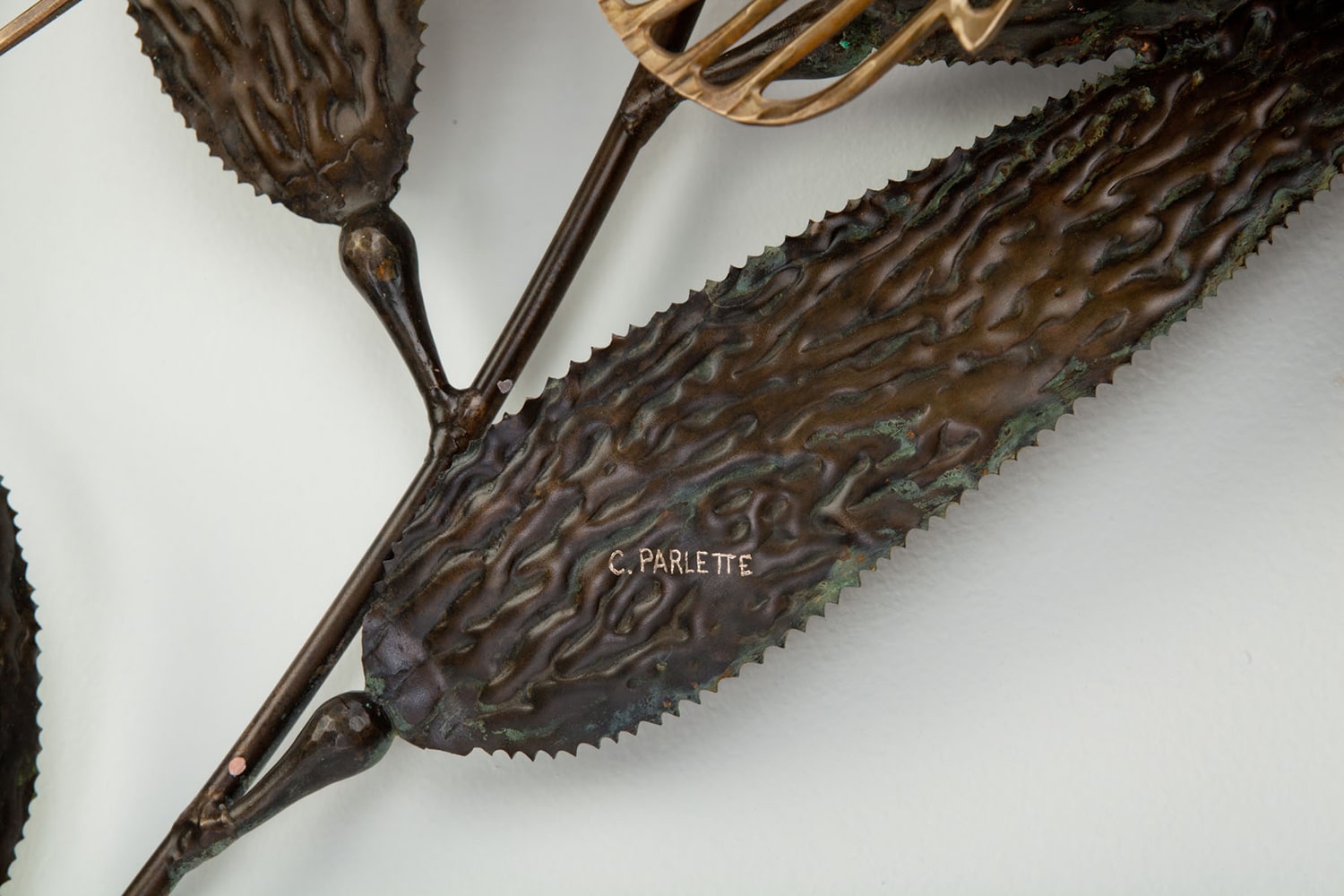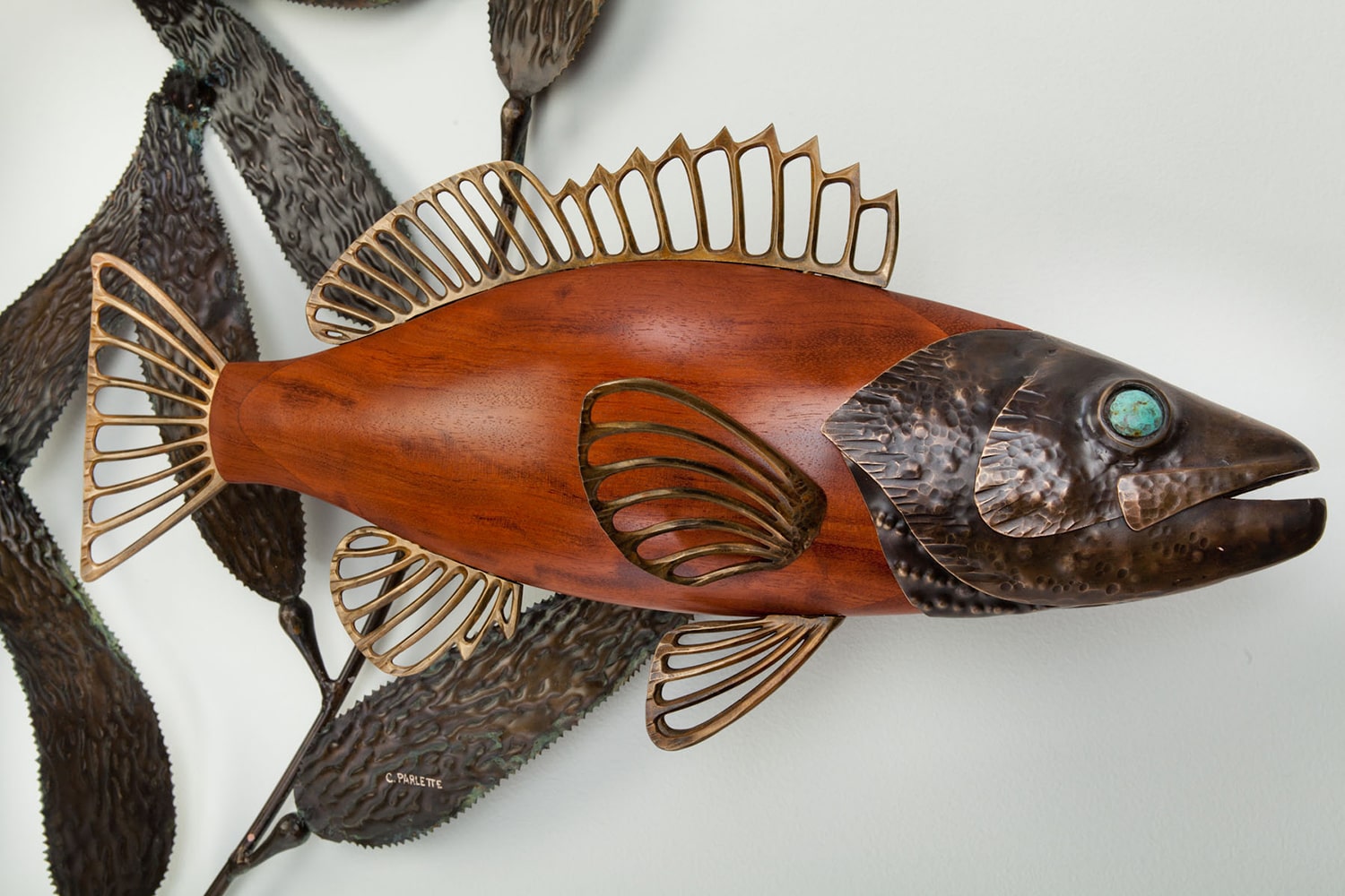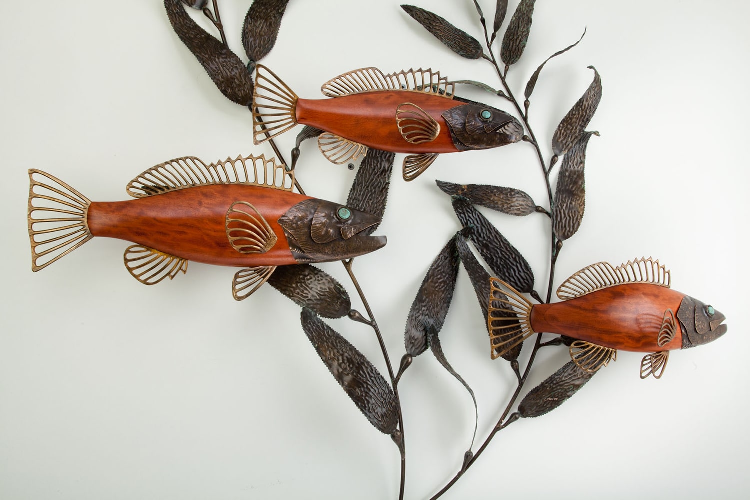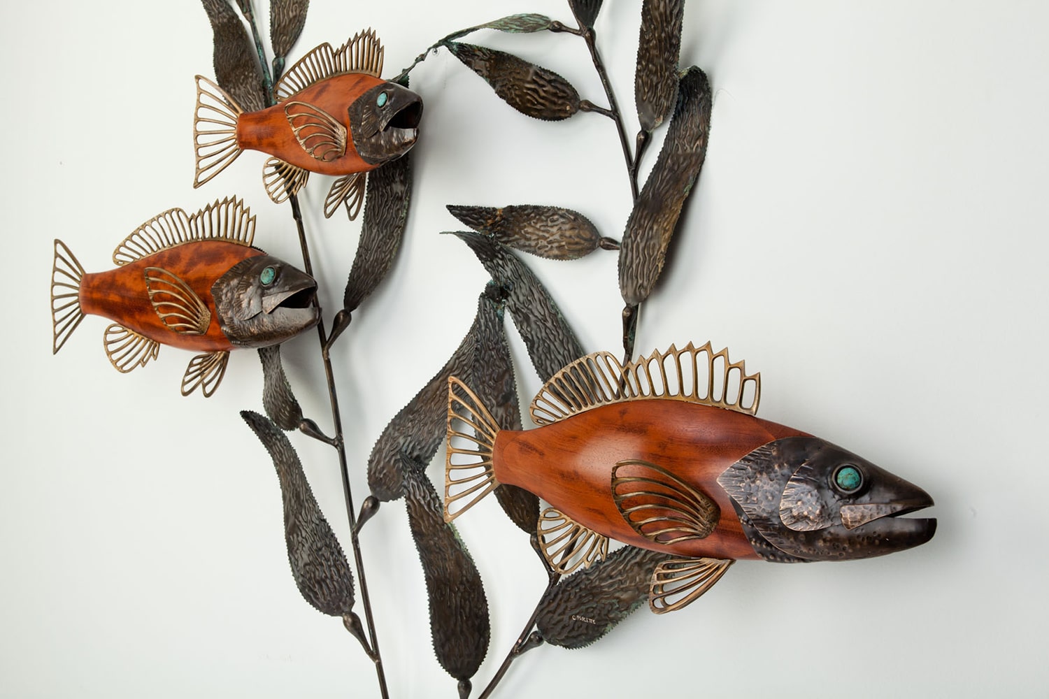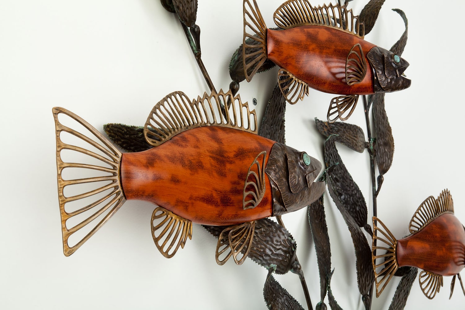 With its checkerboard patterning, bubinga wood represents well the markings of the calico bass, and Calicos features a school of these fish swimming through flowing kelp. The different angles of the kelp’s leaves and the fishes’ outstretched fins capture both the motion of this fish as well as the movement of the environment in which it lives. Bronze is paired with bubinga wood for the fish, and the kelp is hammered and welded bronze.