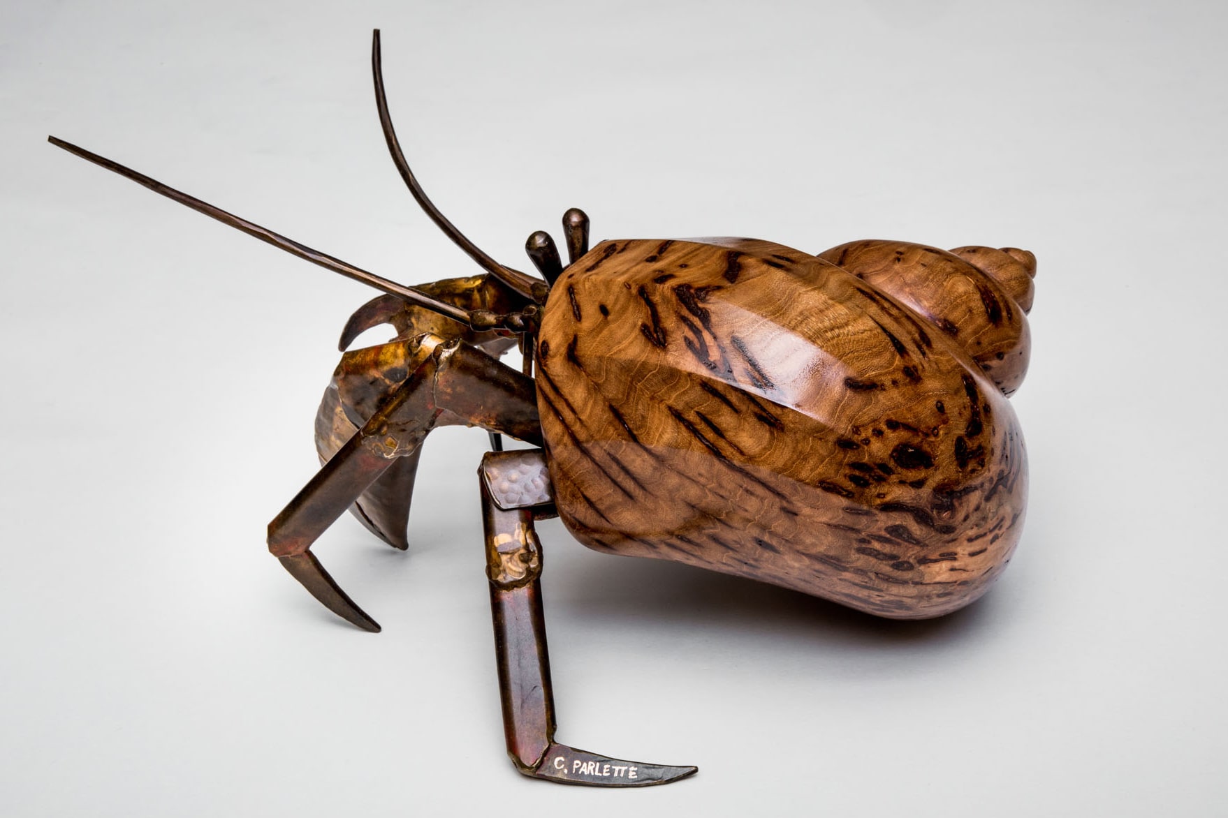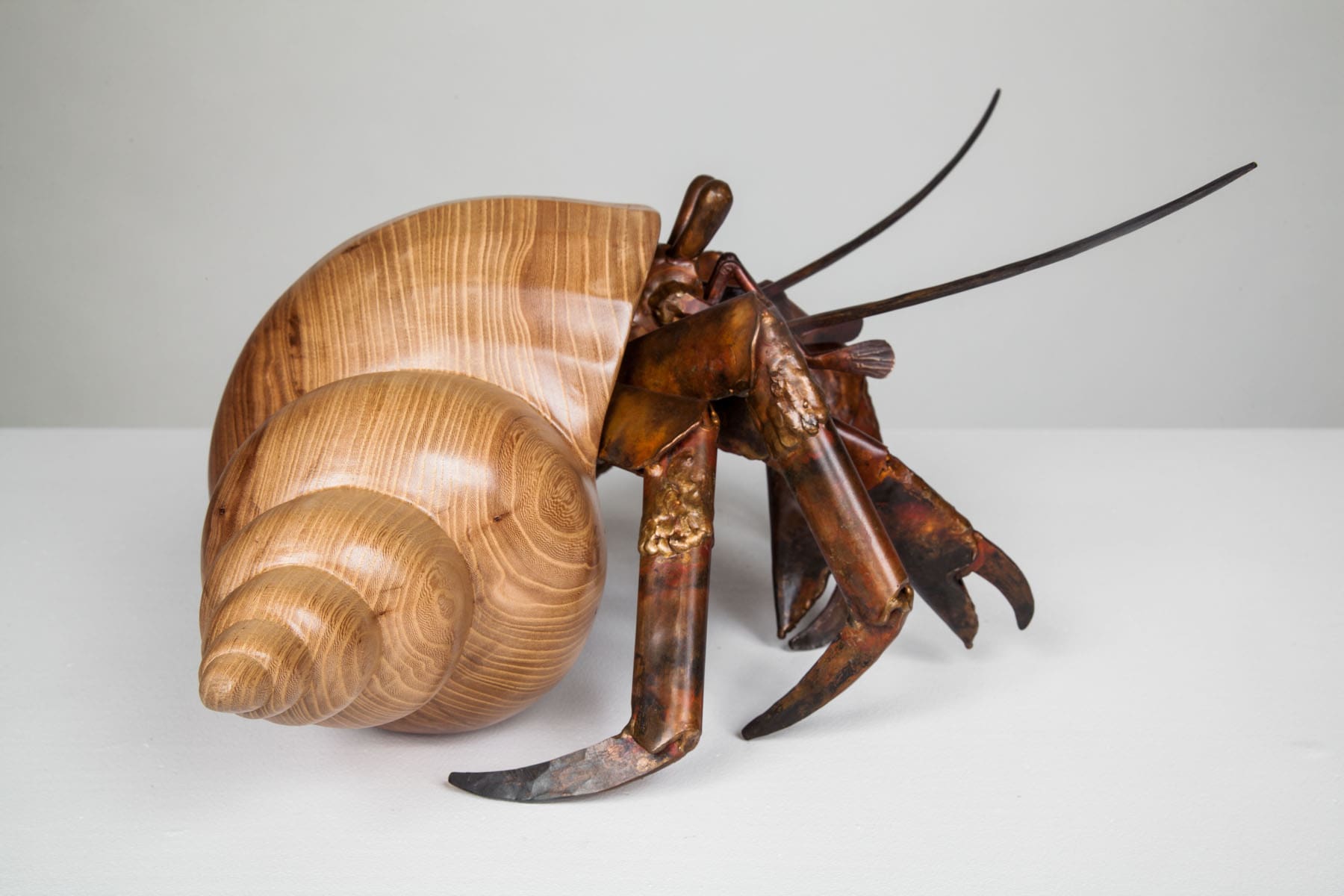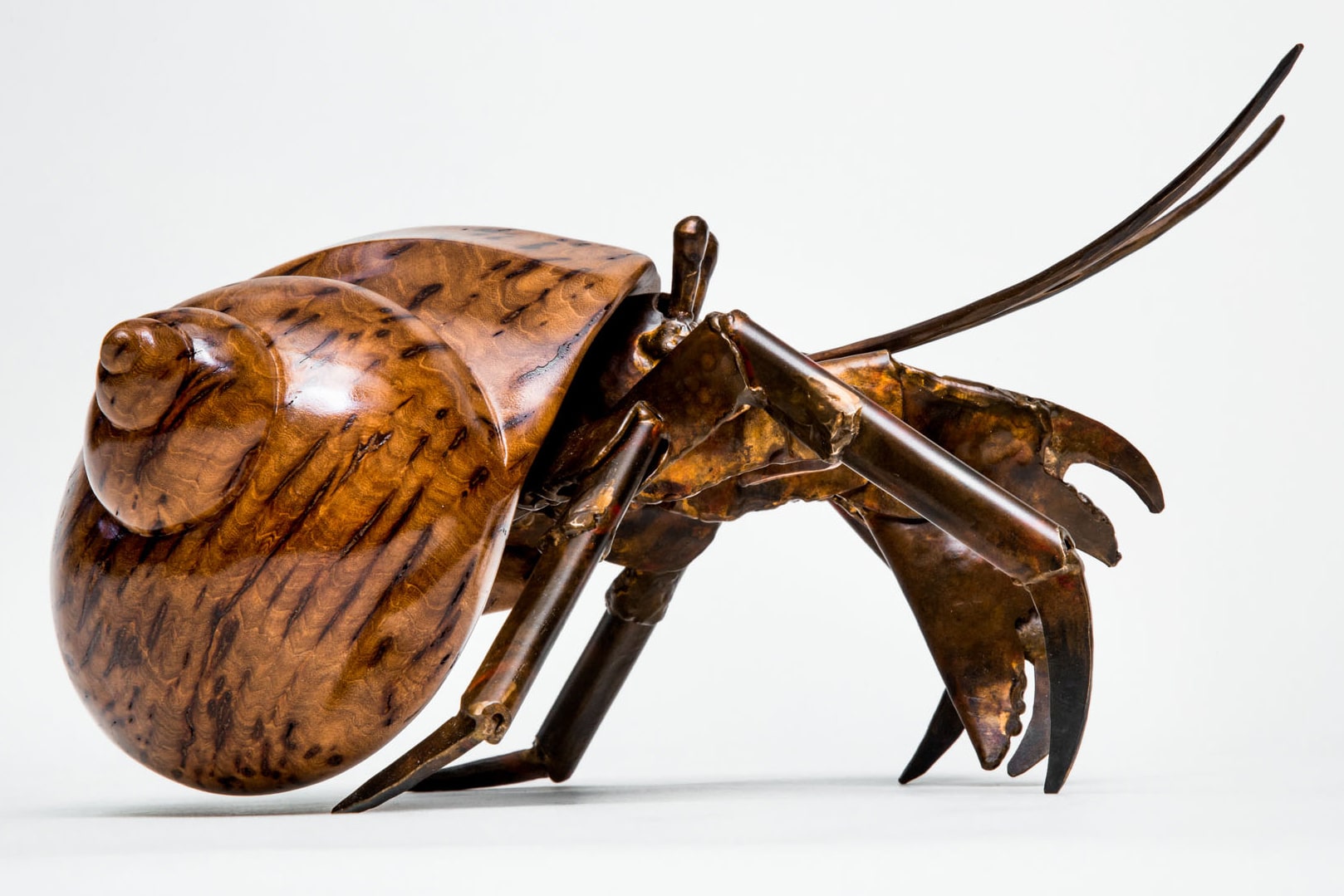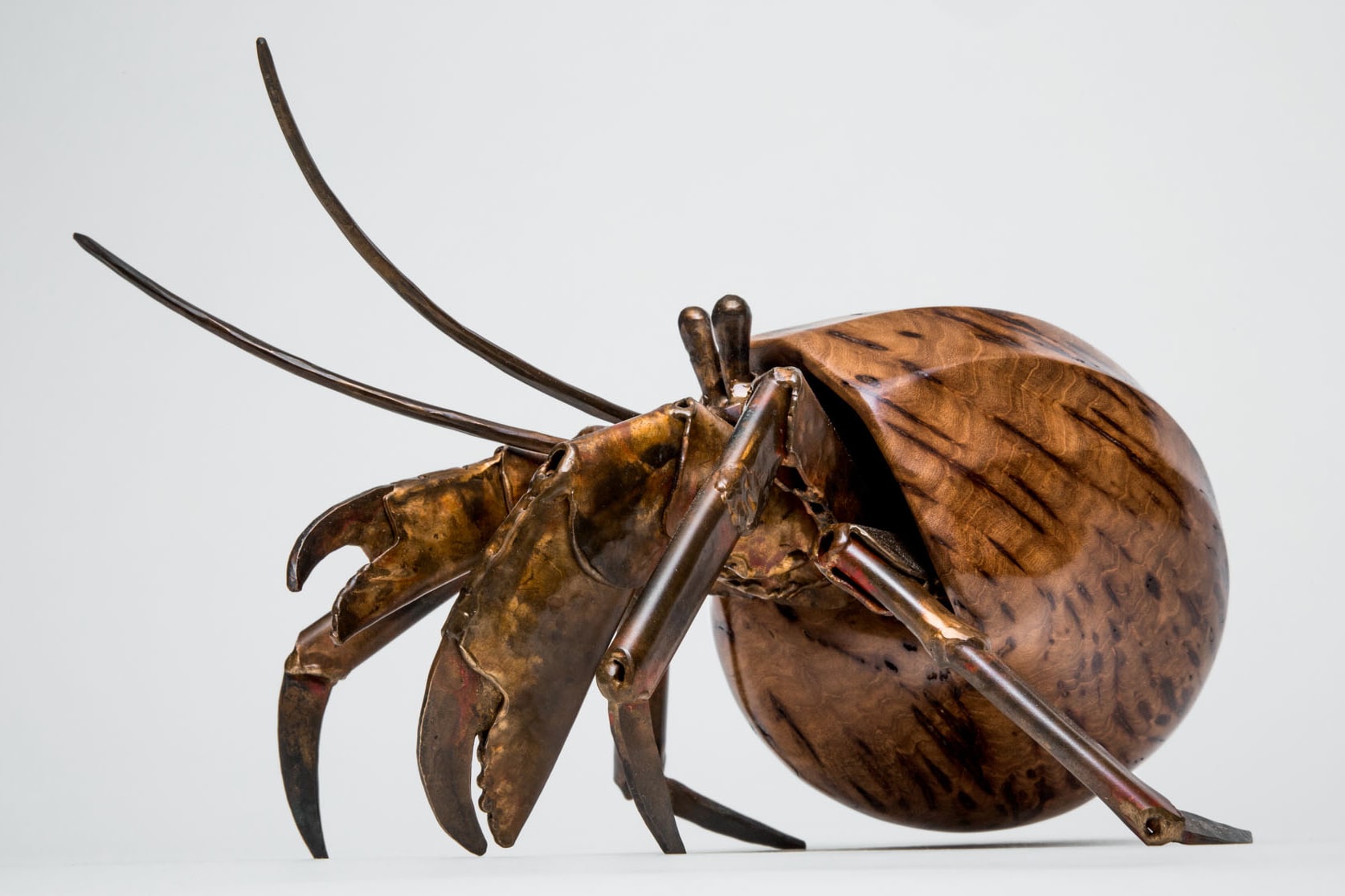 A hermit crab is always on the lookout for its next shell, its new and even better home. As the two vagabonds of Finders Keepers illustrate, the entire line of hermit crab sculptures features an assortment of elegant shell shapes in a variety of different woods. Every piece features a welded bronze hermit crab in a stunning wood shell.