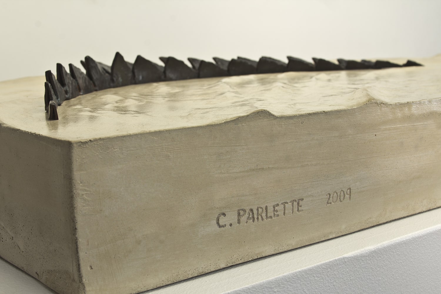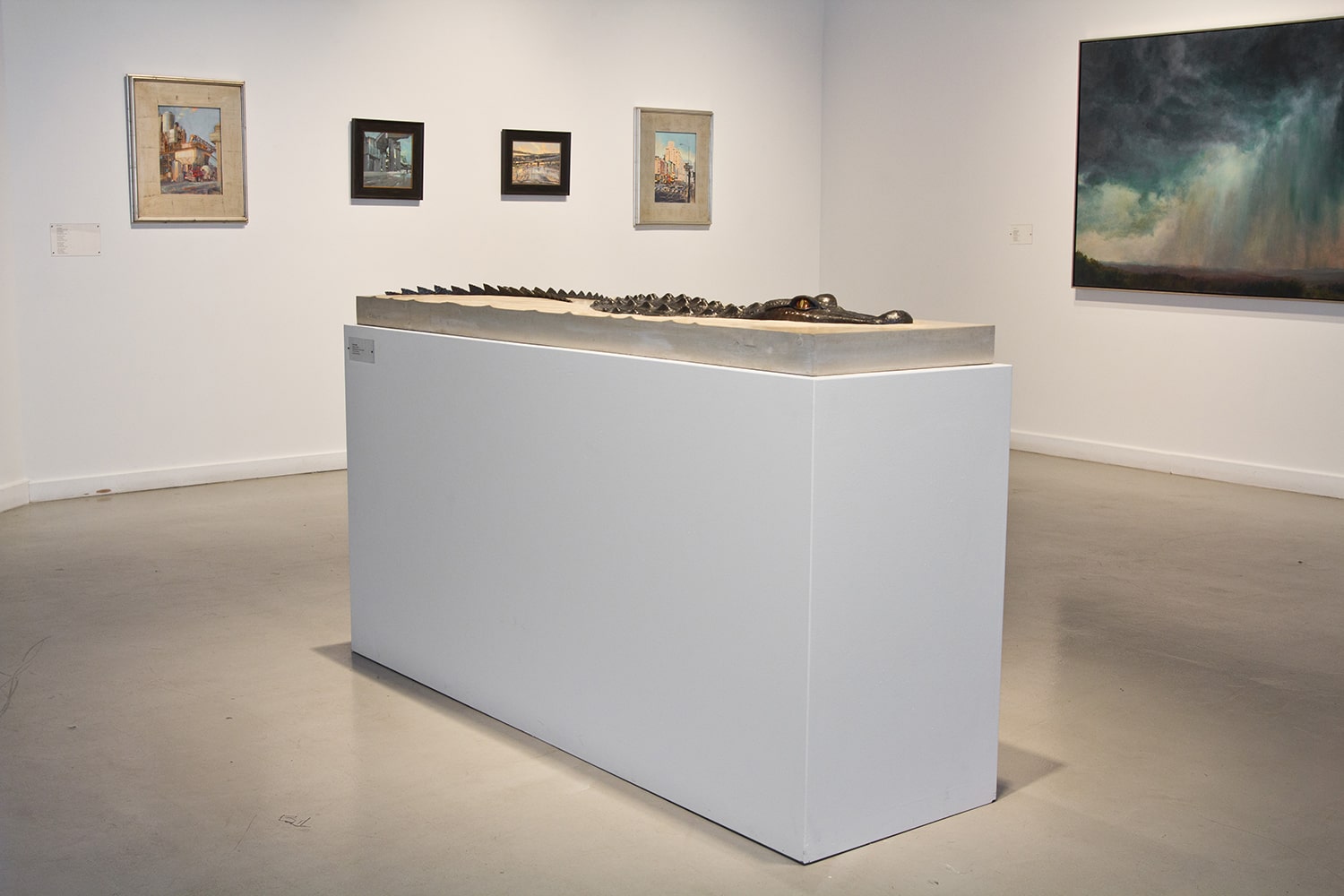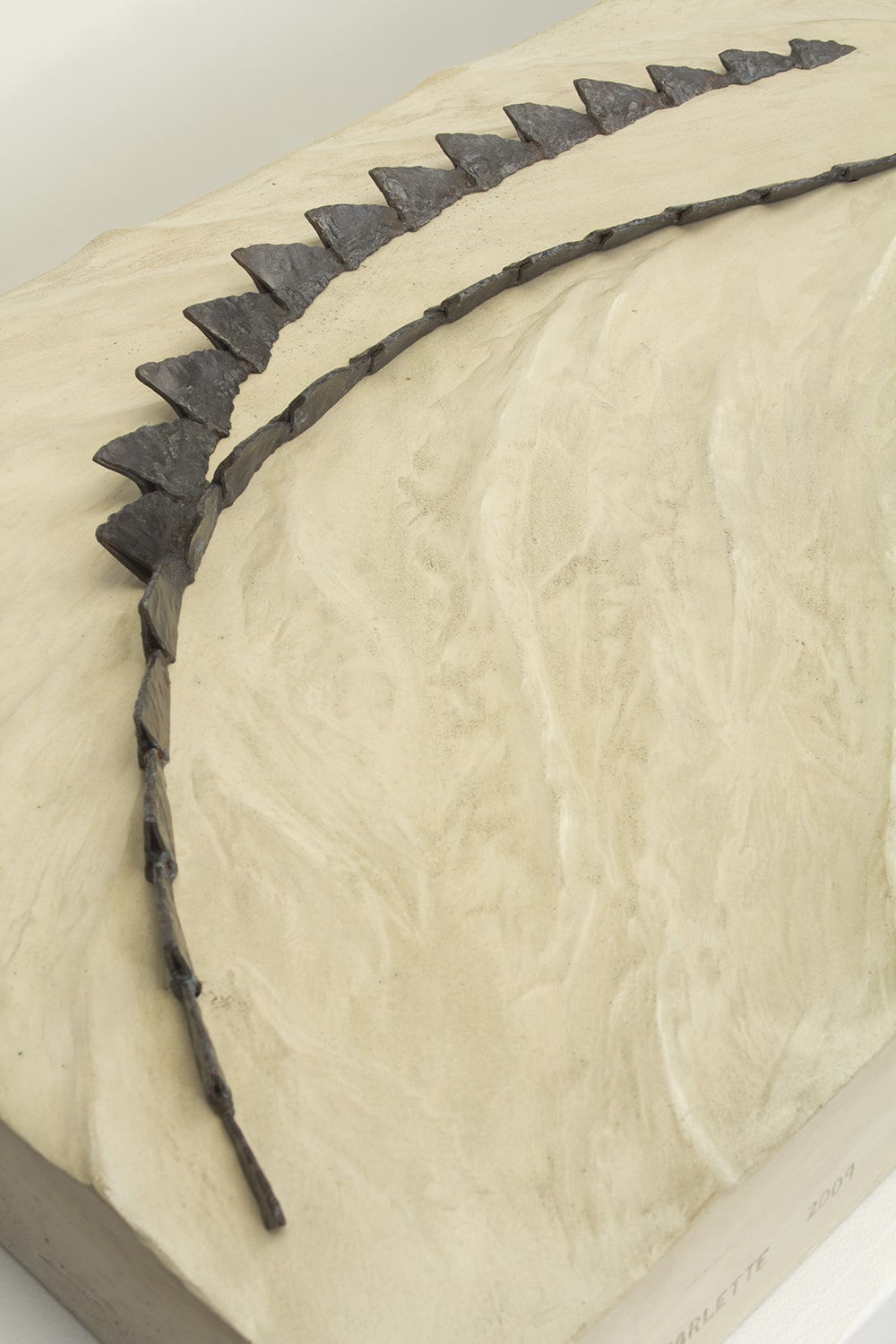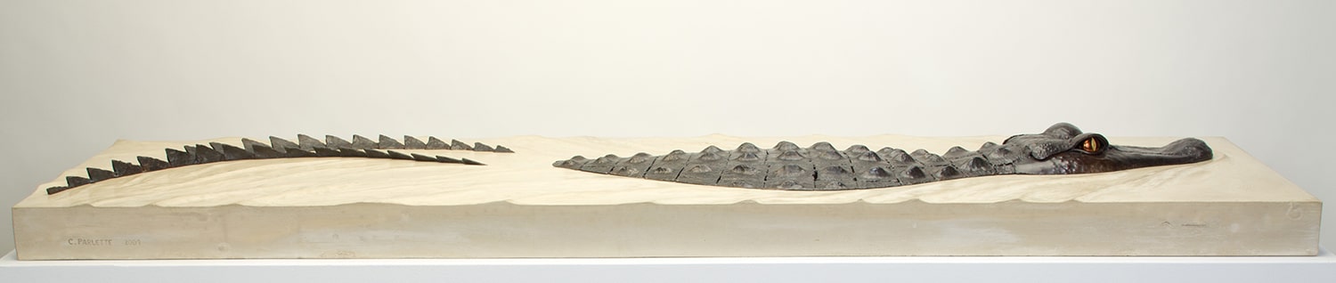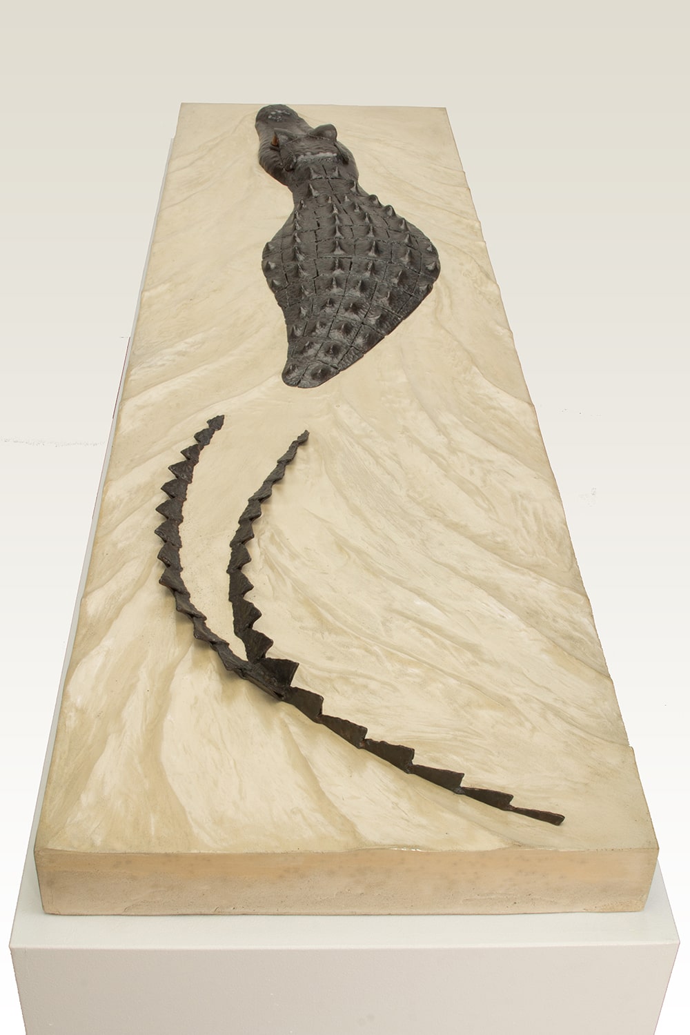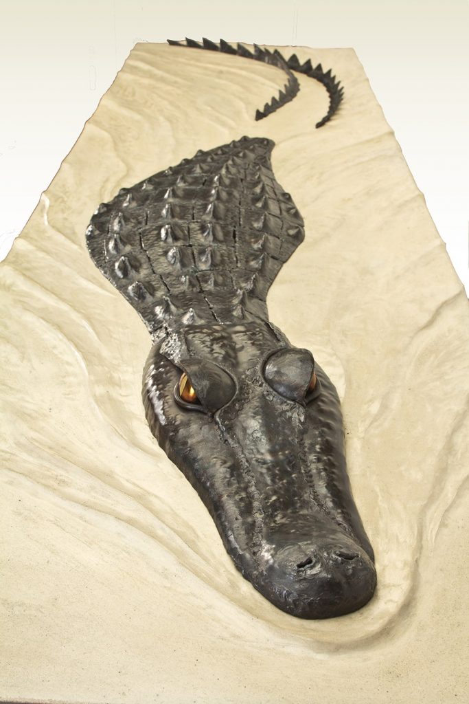 Each piece of the alligator was handforged out of steel and then welded together, giving it the prehistoric and threatening look characteristic of these creatures. The eyes (these Hungry Eyes) are made of polished brass, and the base is concrete with sculpted ripples suggesting the alligator’s movement through the water. In the wild, when all you see is the head and top of the back of this stealthy predator, you know you’re in trouble.