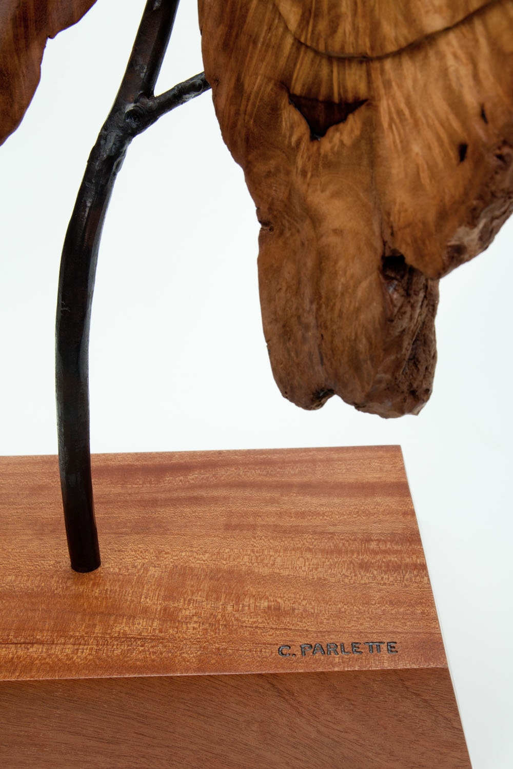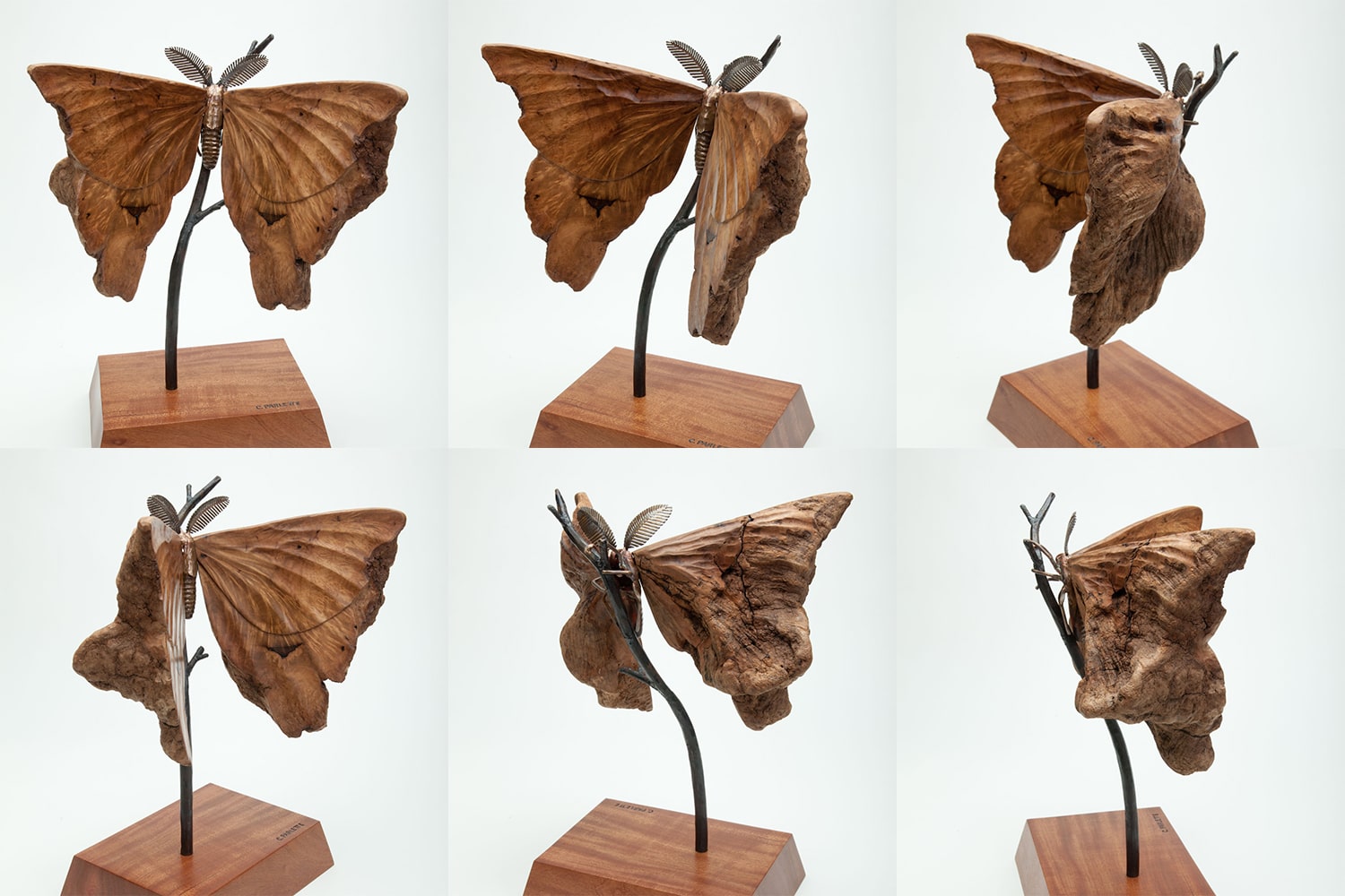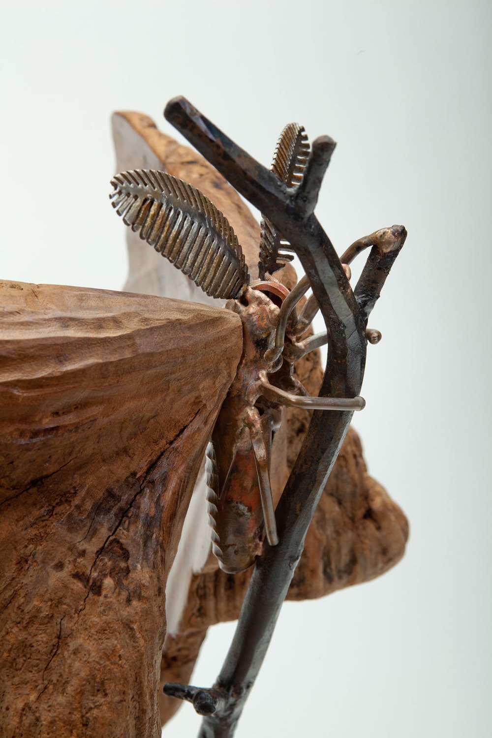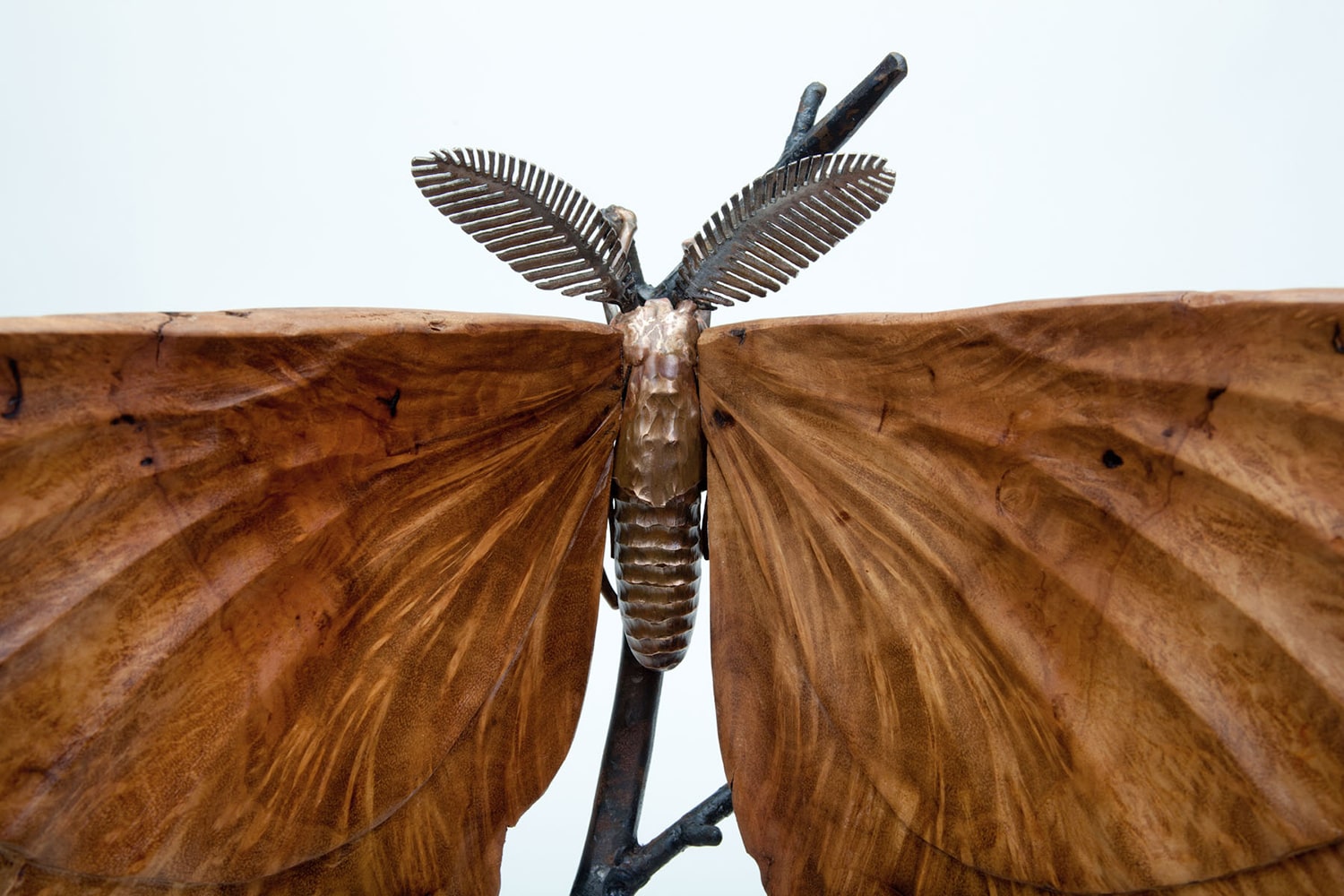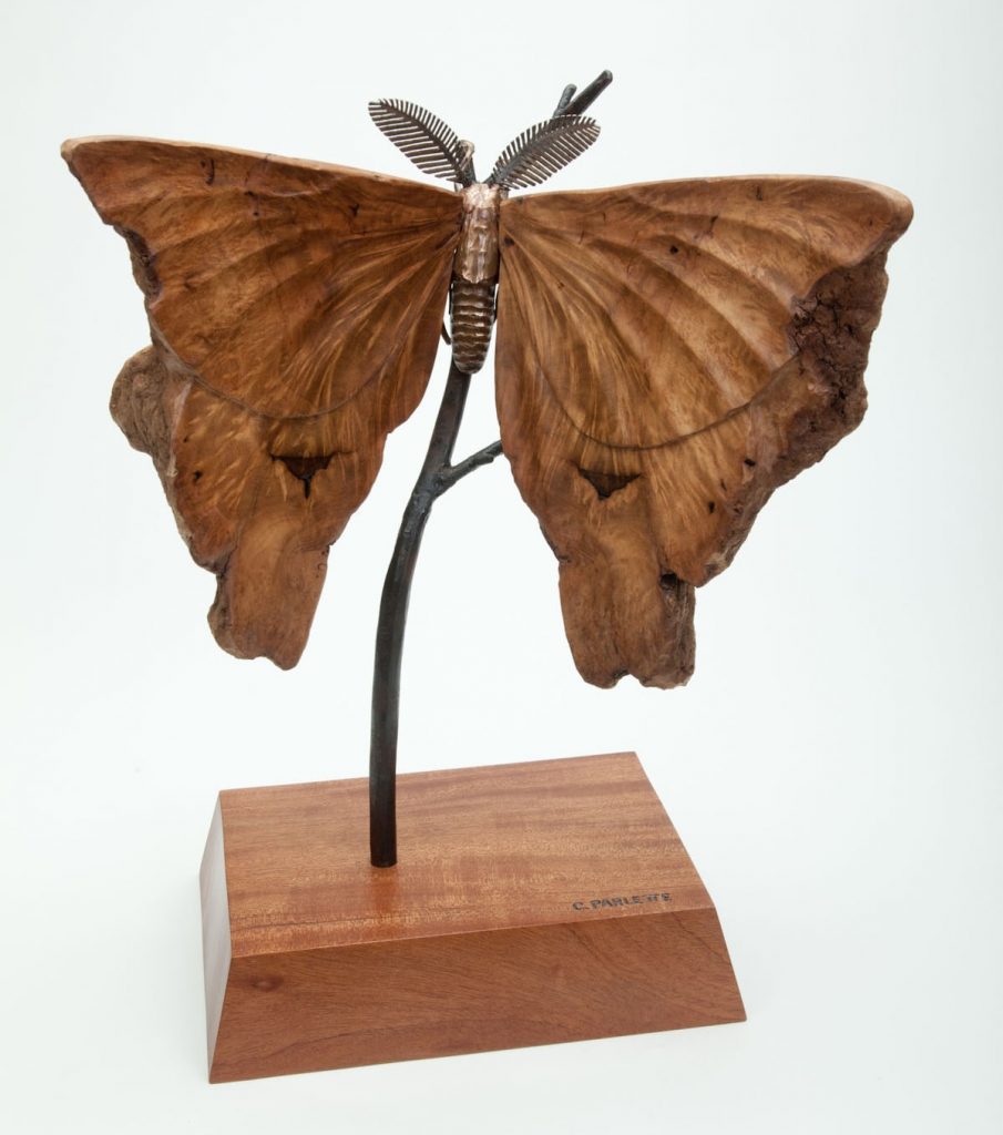 Rather than emerging from a pupa, Inner Beauty had its humble beginnings in a small, easy-to-overlook piece of driftwood (but then the wood was cut in half). Suddenly visible was a stunning pattern as well as a dark spot resembling the eye spots on the wings of some moths. This moth’s wings are carved, and the body is welded bronze and stainless steel. The branch is made of steel, and the base is mahogany.