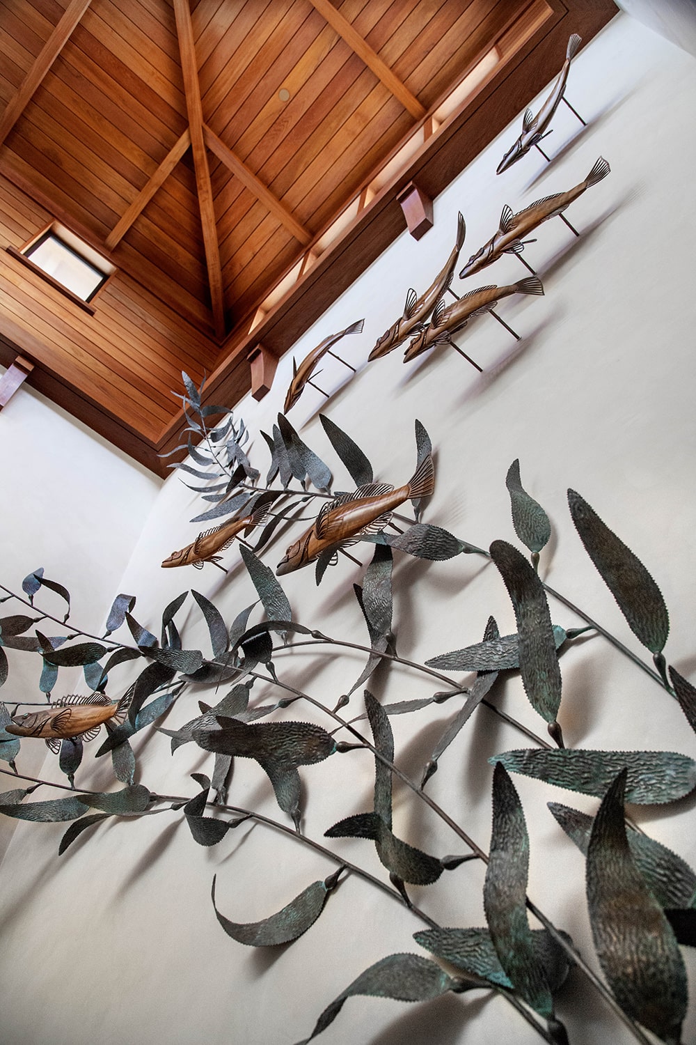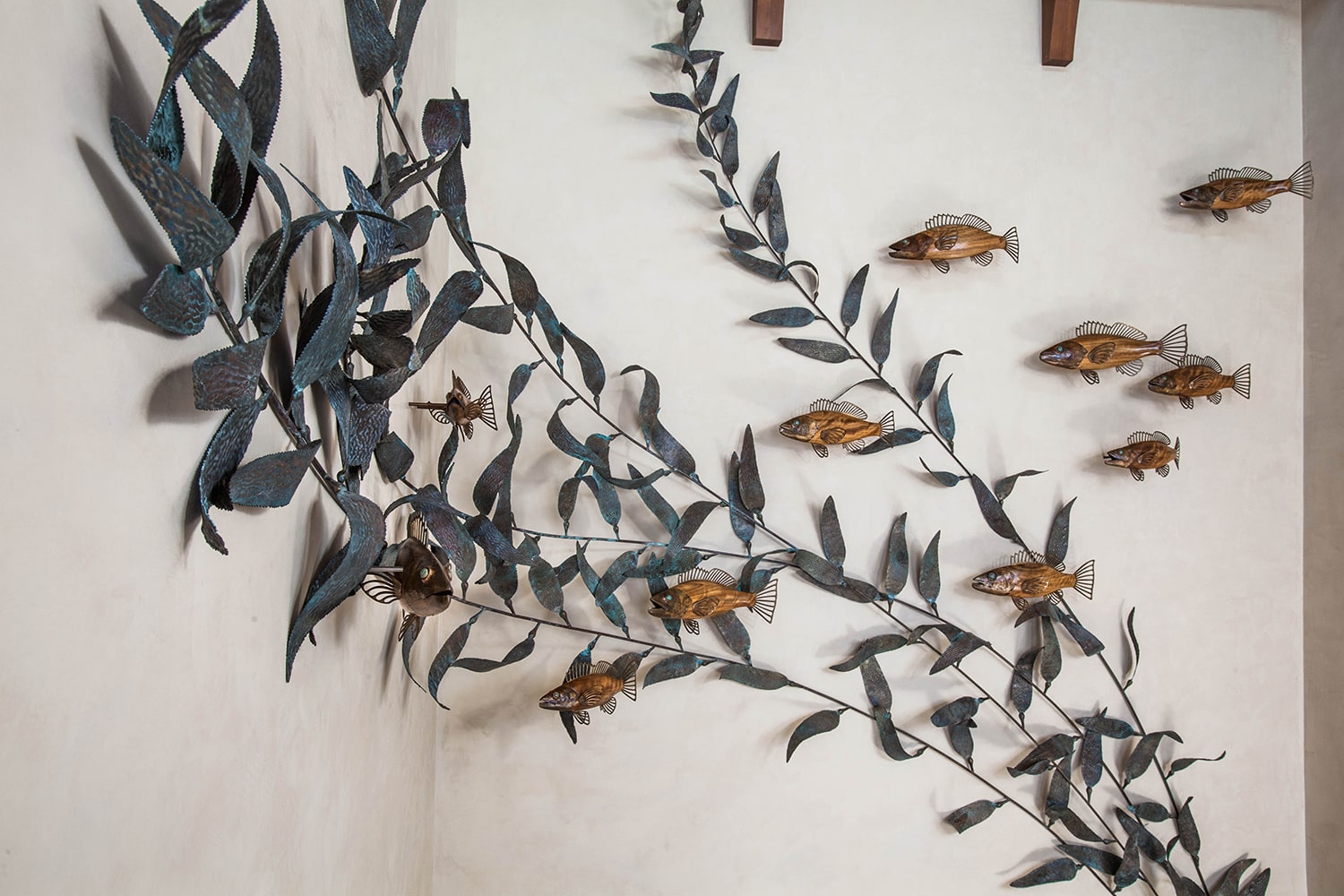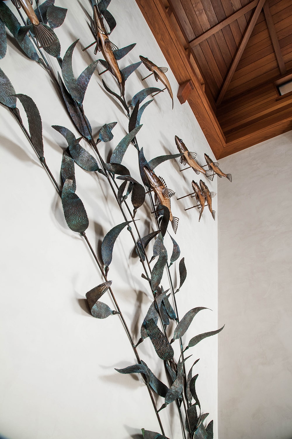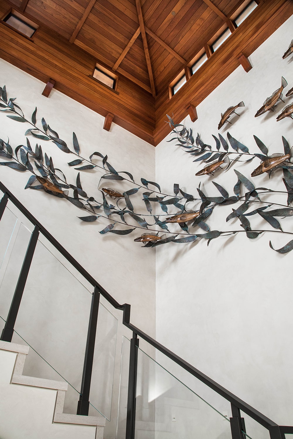 A commissioned piece for a private residence, Kelp Forest provides an artistic focal point to the large stairway. The scale of the stairway and its walls necessitated a large sculpture. Built in sections and then seamlessly connected, the piece is more than 30 feet long and 20 feet high. An especially appealing feature of this kelp forest is the overhead section that curves between the walls, providing a powerful sense of flow as well as a dimensional dynamic that makes the entire structure seem to be in motion.