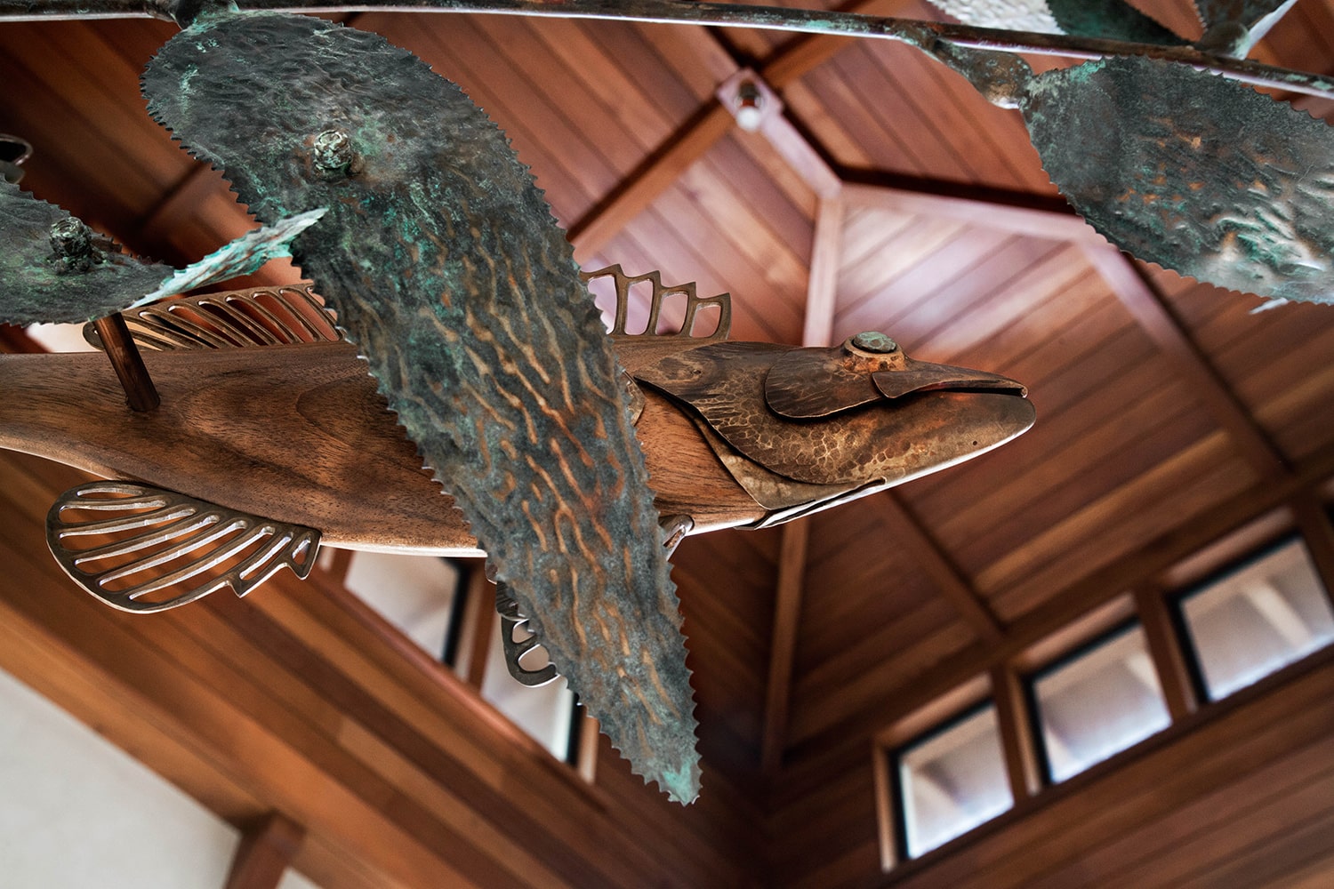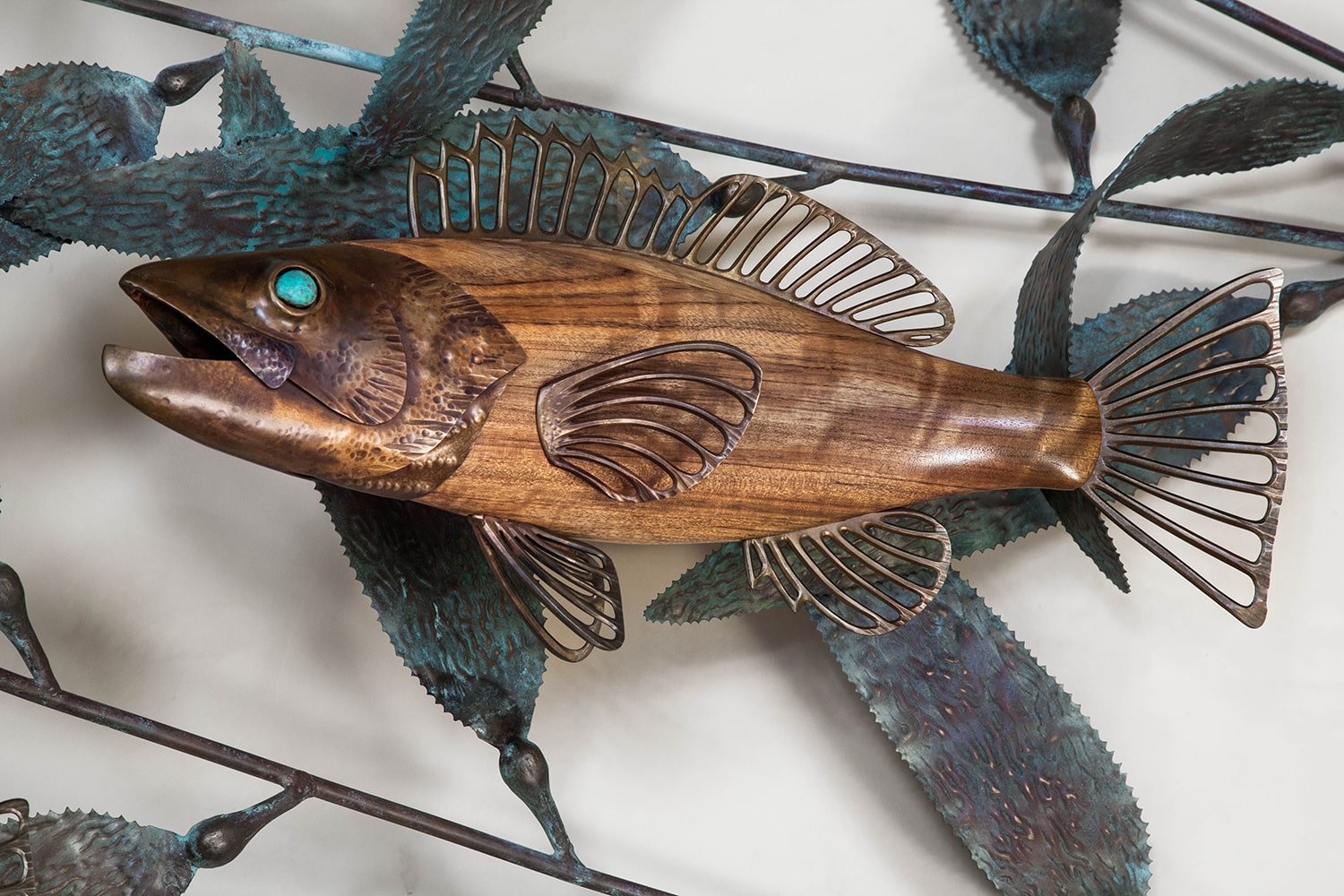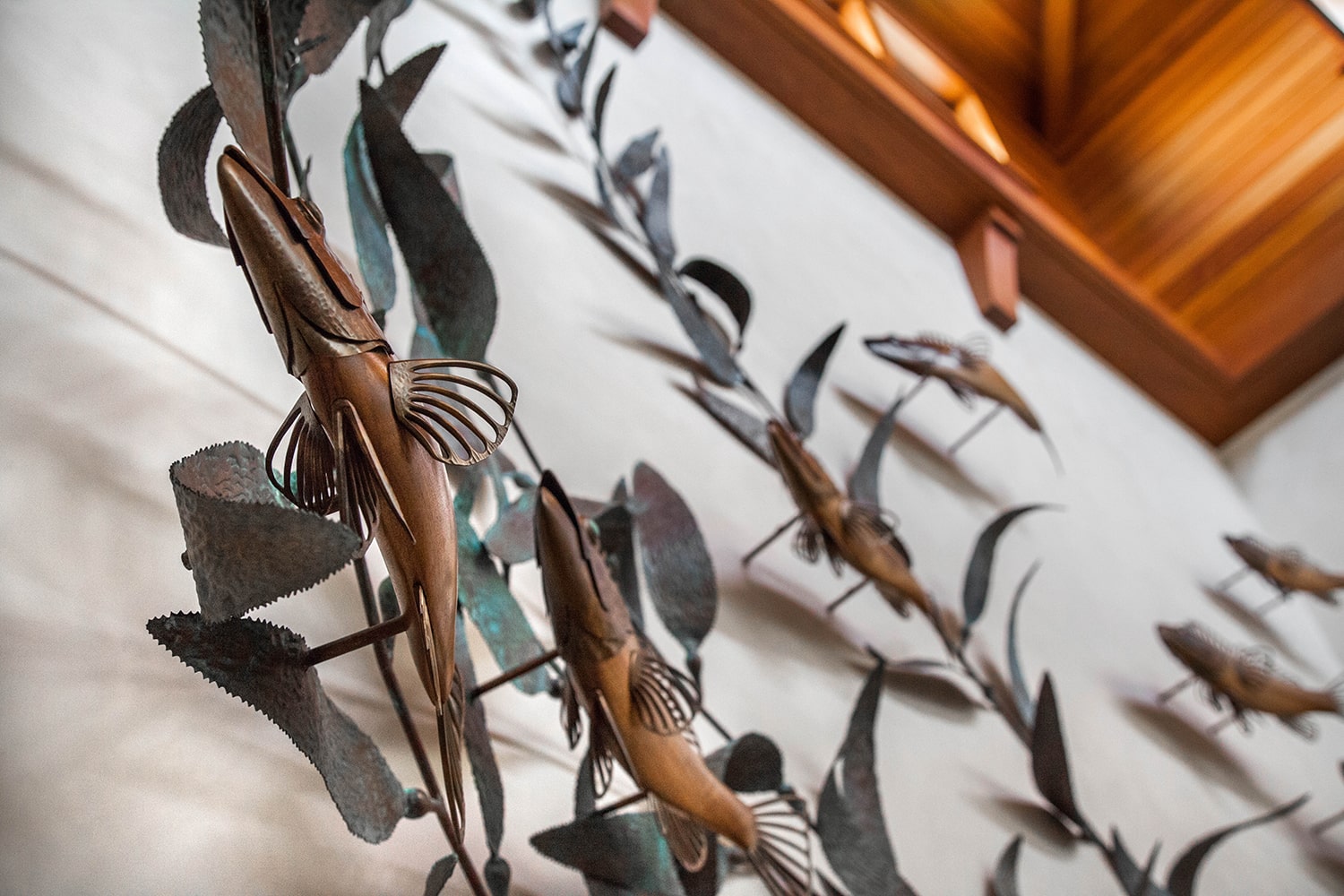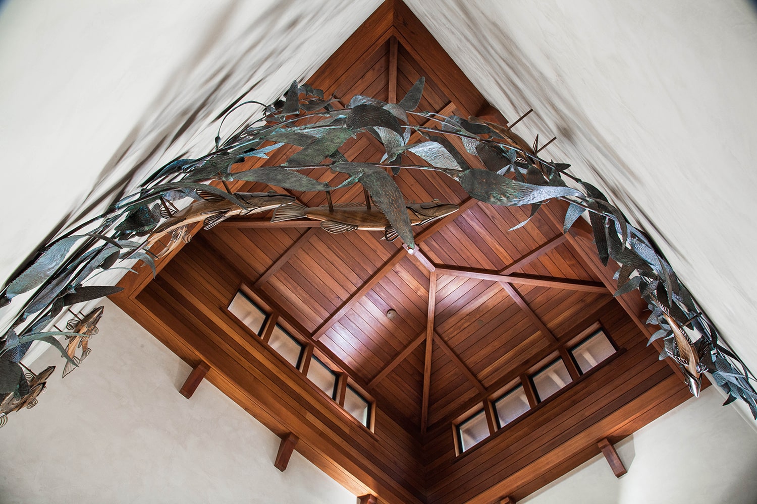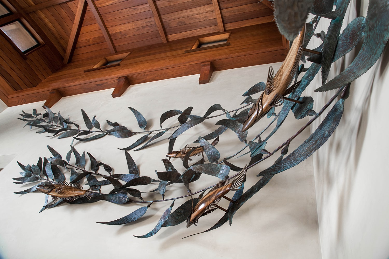 A commissioned piece for a private residence, Kelp Forest provides an artistic focal point to the large stairway. The scale of the stairway and its walls necessitated a large sculpture. Built in sections and then seamlessly connected, the piece is more than 30 feet long and 20 feet high. An especially appealing feature of this kelp forest is the overhead section that curves between the walls, providing a powerful sense of flow as well as a dimensional dynamic that makes the entire structure seem to be in motion.
