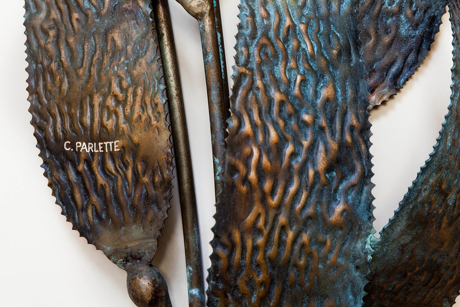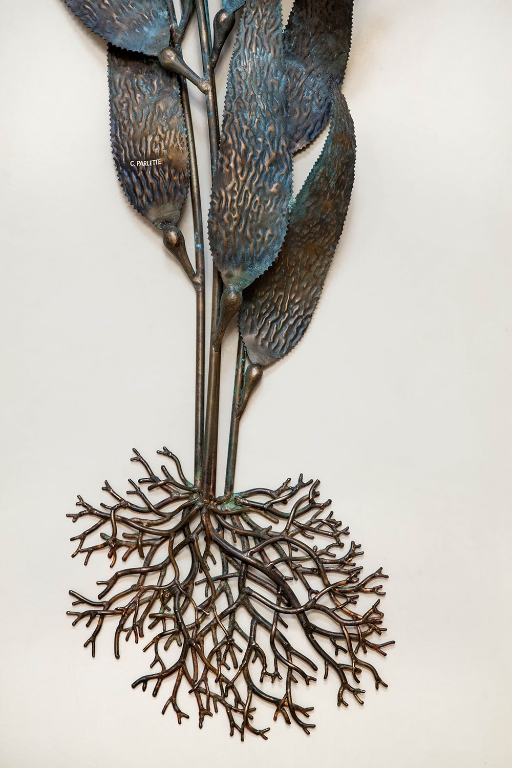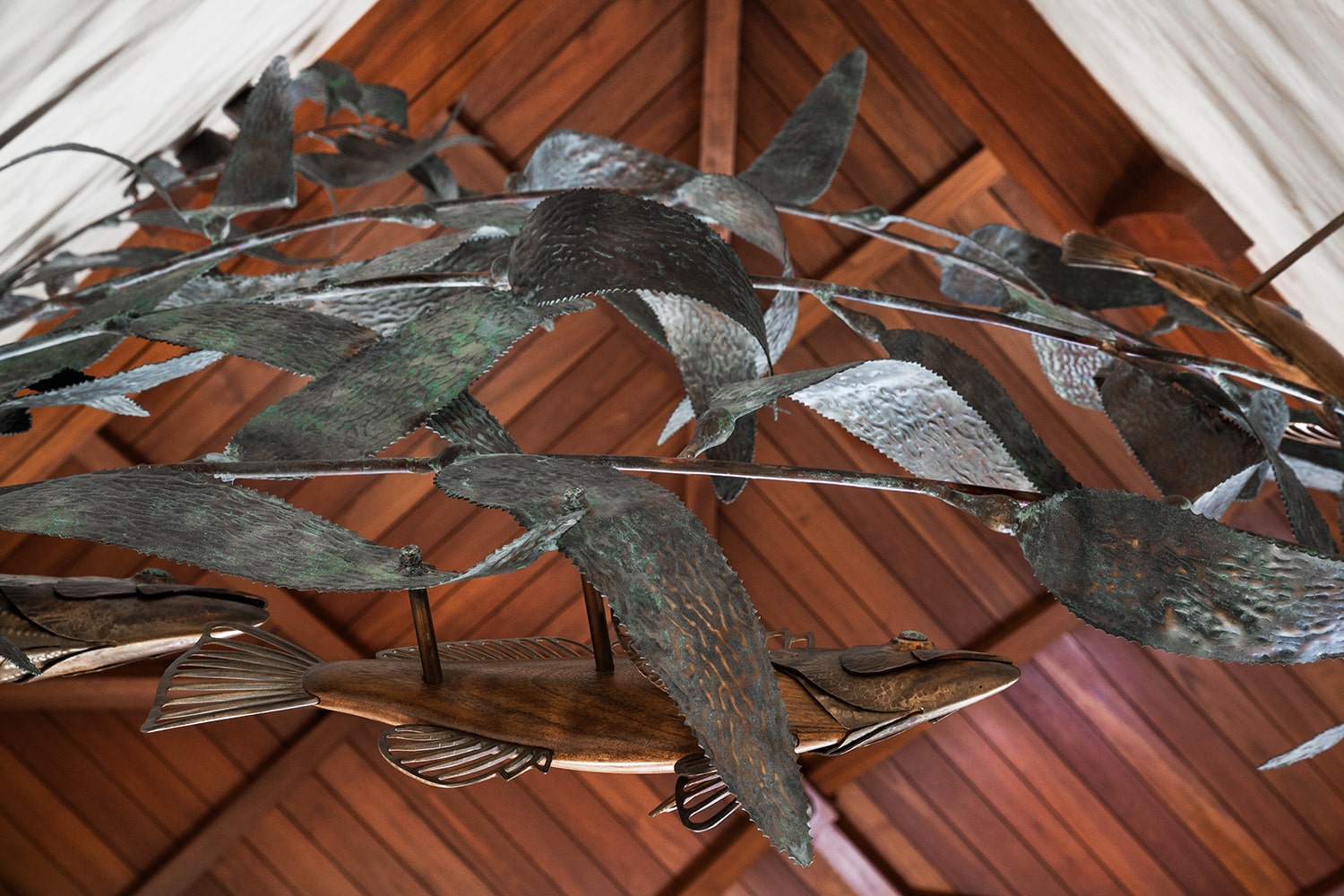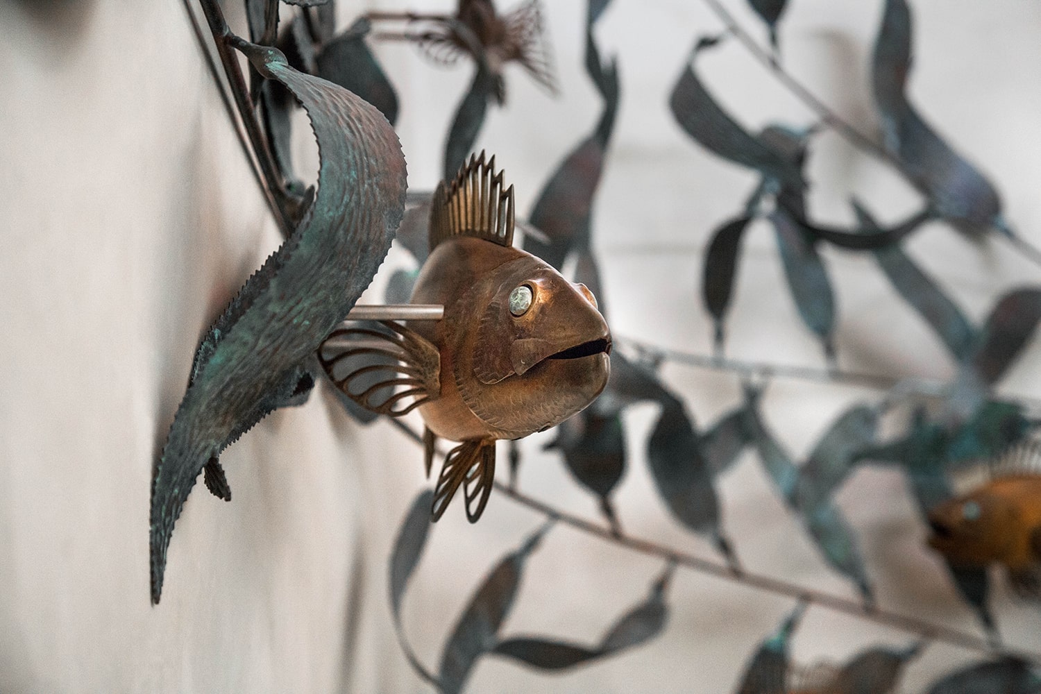 A commissioned piece for a private residence, Kelp Forest provides an artistic focal point to the large stairway. The scale of the stairway and its walls necessitated a large sculpture. Built in sections and then seamlessly connected, the piece is more than 30 feet long and 20 feet high. An especially appealing feature of this kelp forest is the overhead section that curves between the walls, providing a powerful sense of flow as well as a dimensional dynamic that makes the entire structure seem to be in motion.