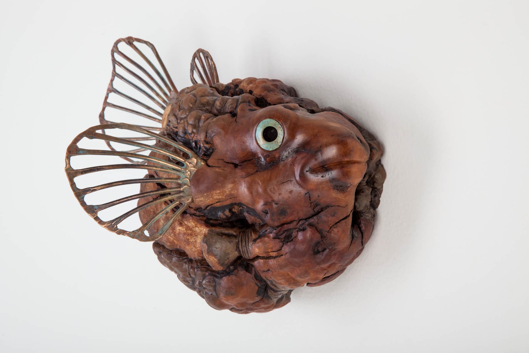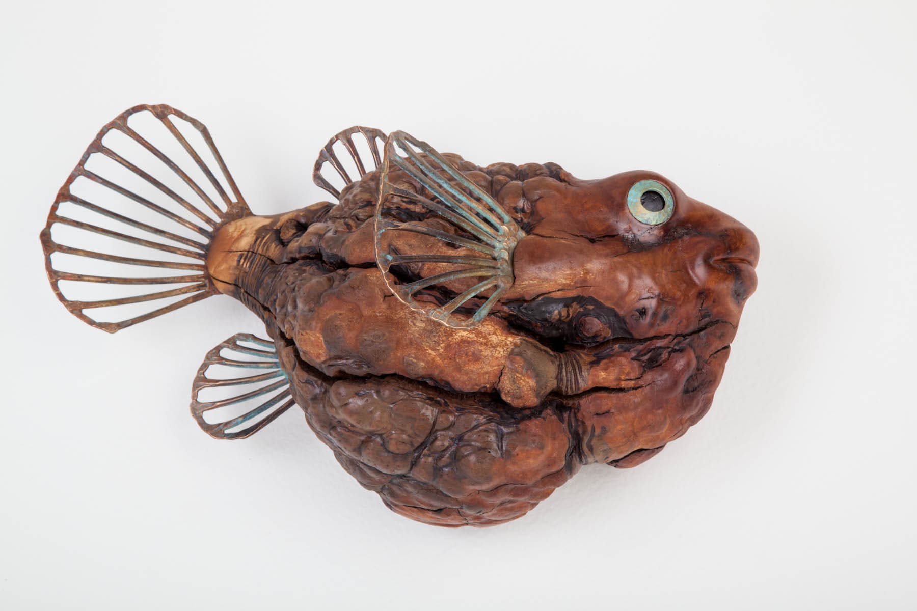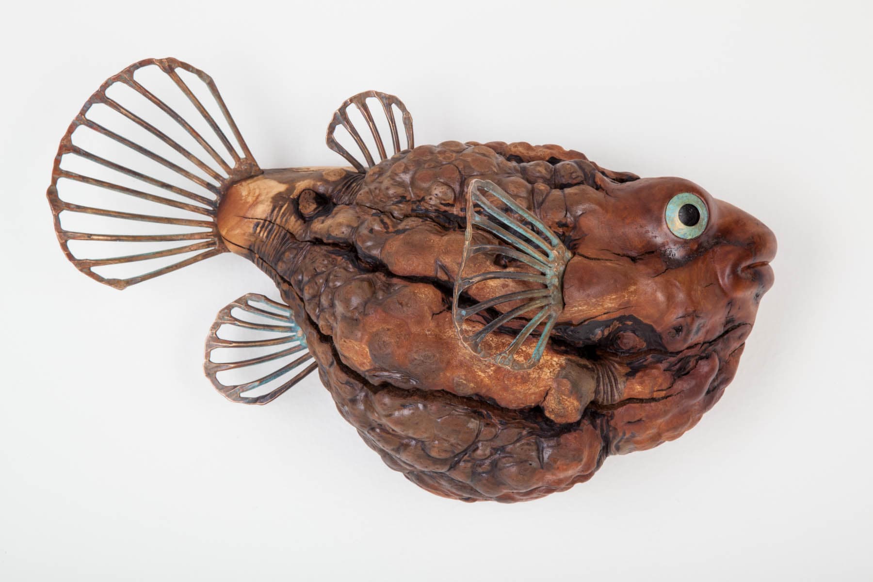 When startled, a puffer fish balloons up in order to appear larger and less palatable to potential predators. Puffed started out as a piece of manzanita burl that had an uncanny resemblance to an inflated puffer fish, so much of the burl remained in its natural state. Portions of the wood are carved, and the fins and eye are welded out of bronze.