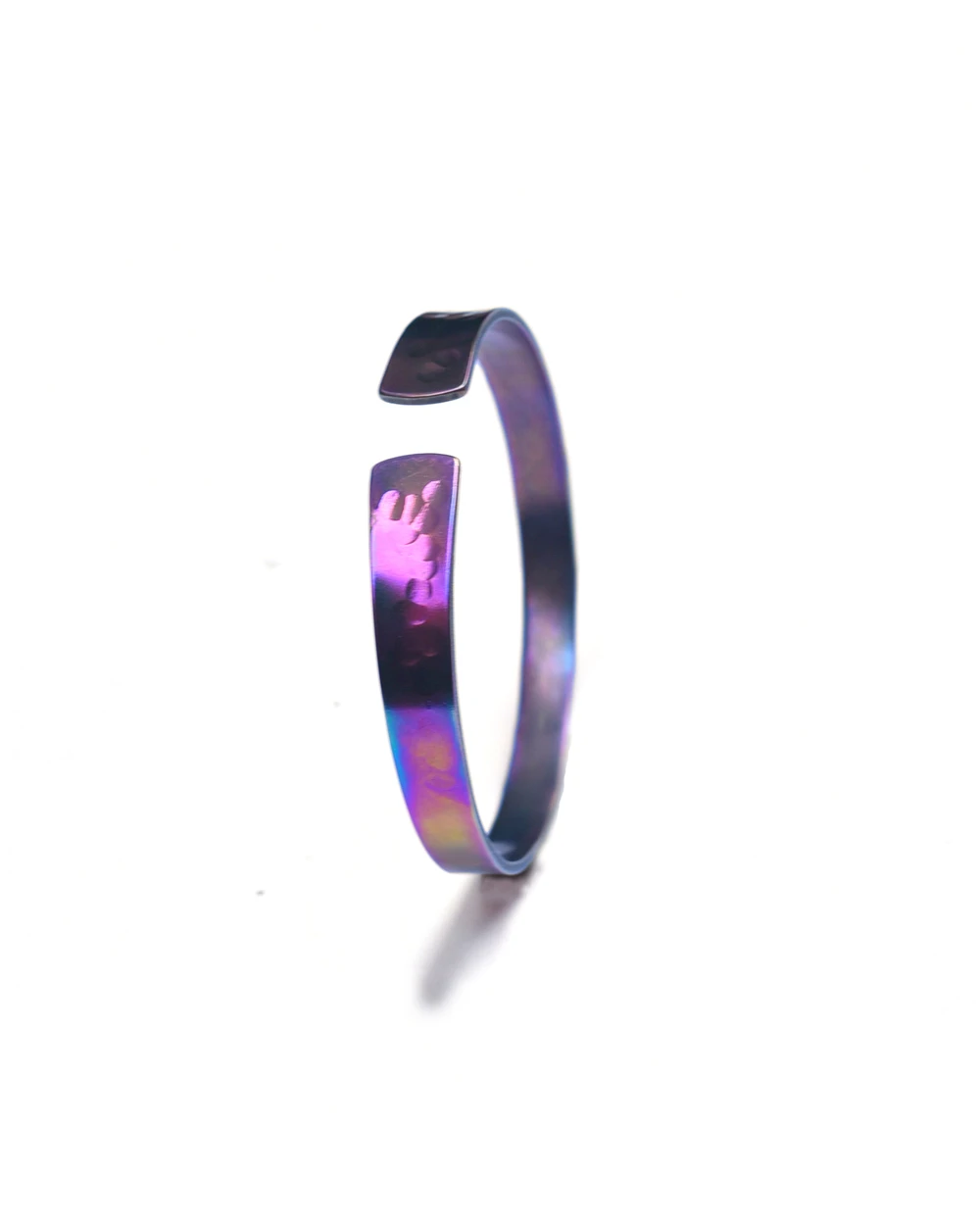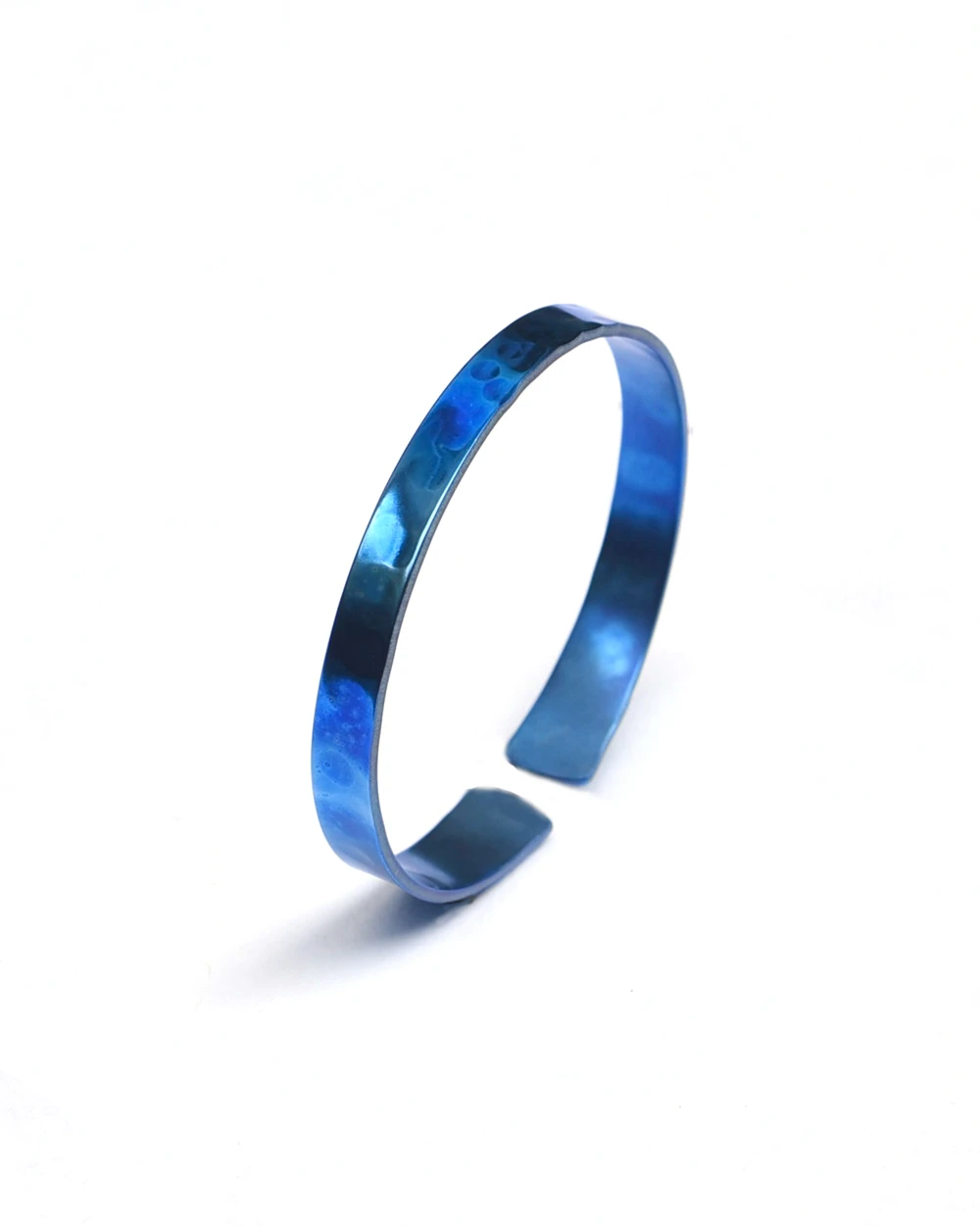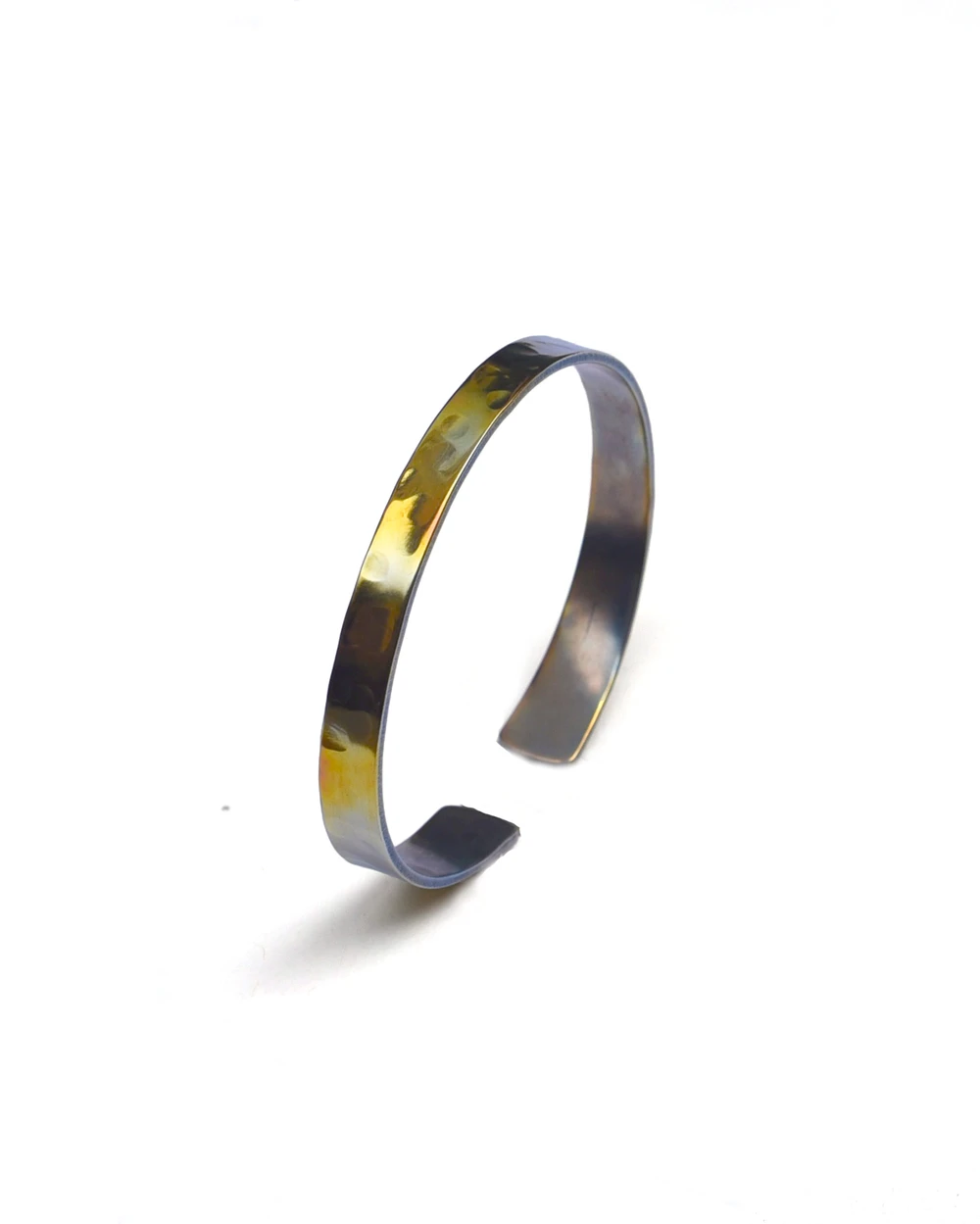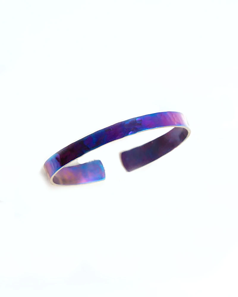 The perfect stacking bangle. The Strand is an artistic, handmade bracelet that is sure to turn heads. Made from durable titanium, it is strong enough for everyday wear and tear while the sleek style makes it perfect for a night out as well. Made of pure titanium, this bracelet is hammered to reflect the ripples of the ocean. Through the heating process the colors create a iridescent shimmer.