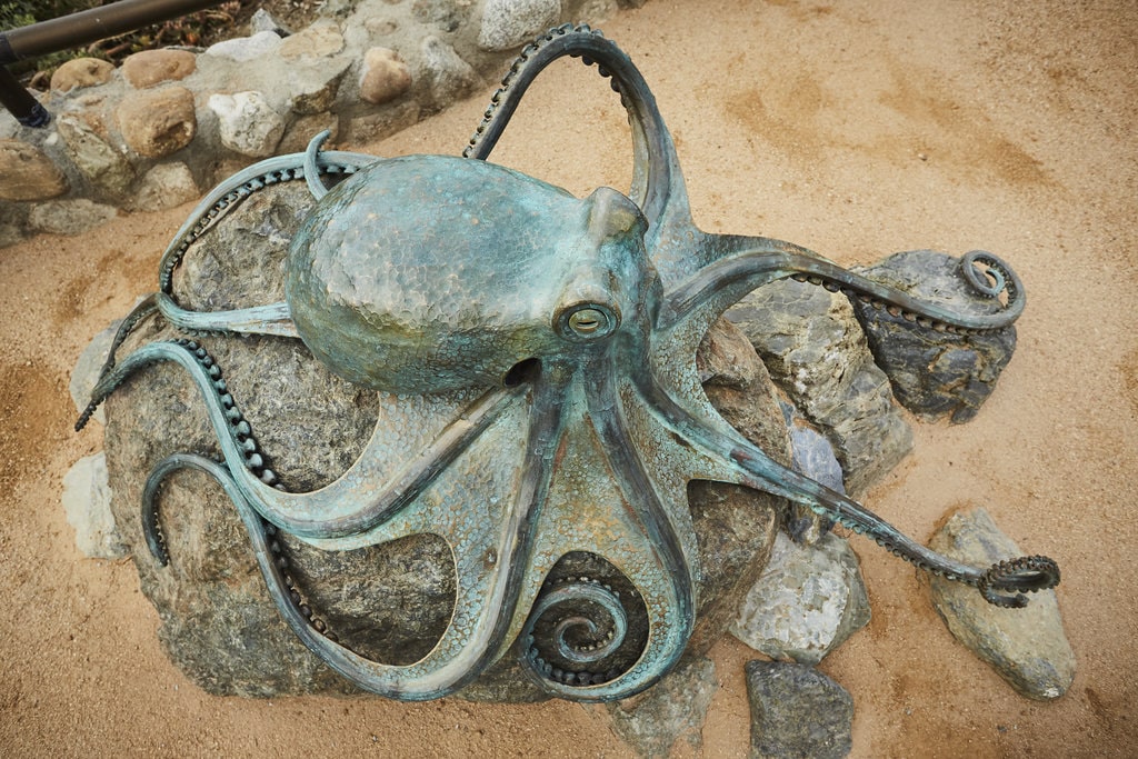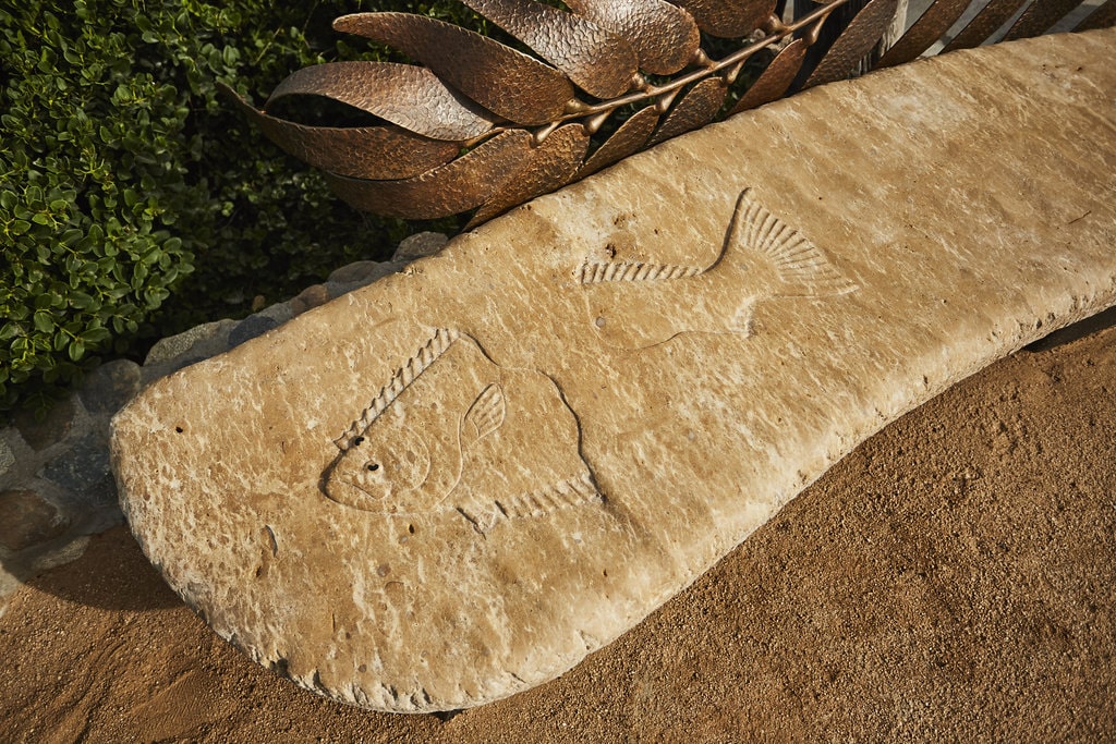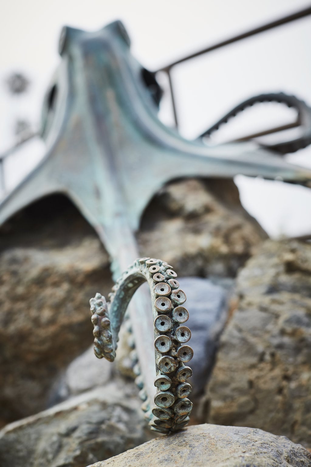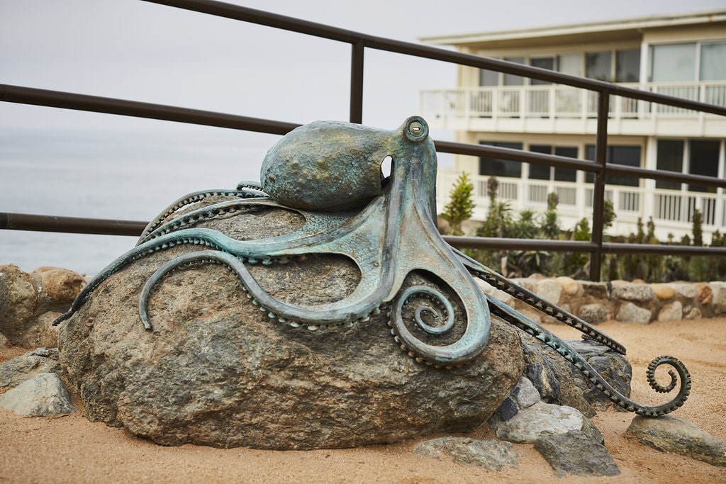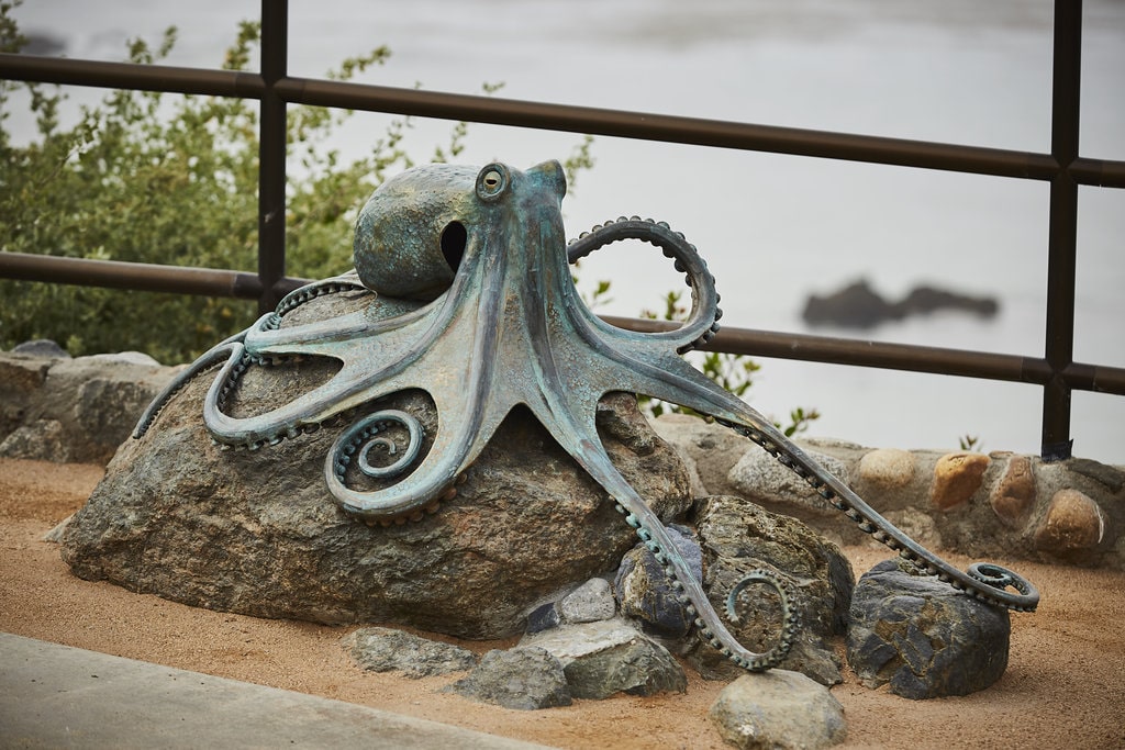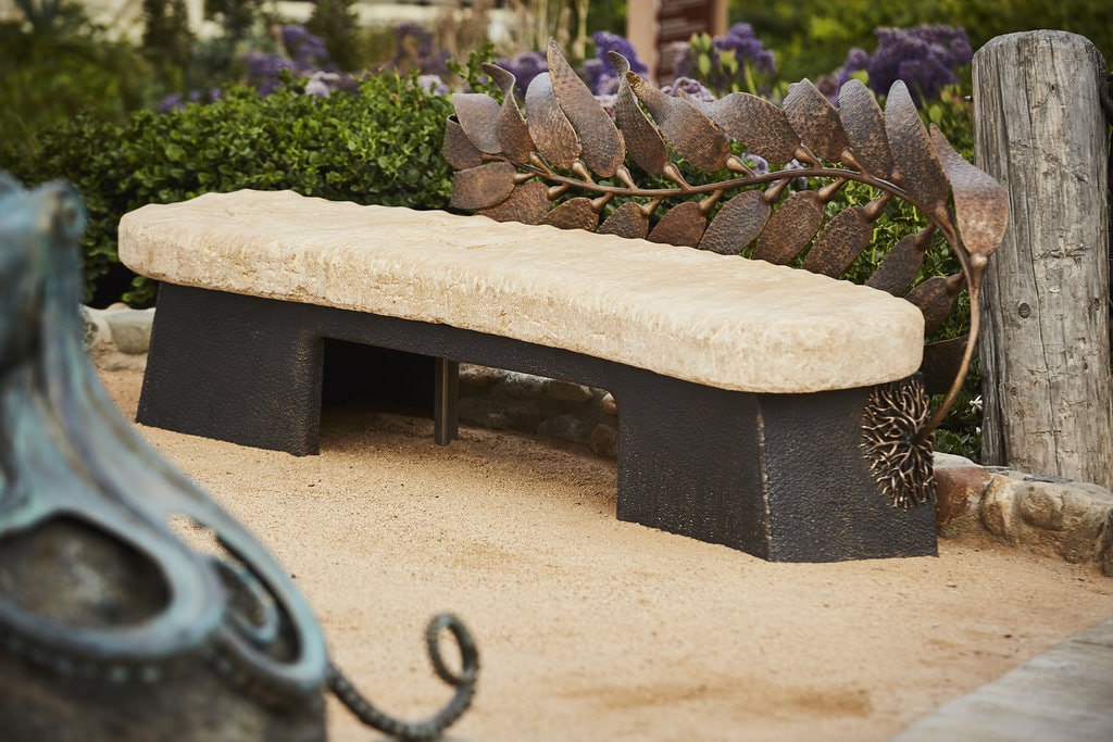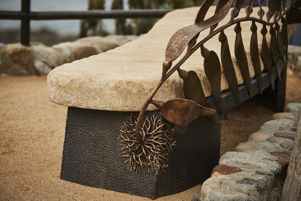Strand of Life is a sculptural bench that stands near a large bronze octopus titled Tidepool Kraken. The two sculptures were commissioned by a private party who donated the works to the City of Laguna Beach in honor of family members. These pieces are located along the north end of Heisler Park on the bluff overlooking Divers Cove. The kelp in this piece represents the donors’ family tree. In the same way that the kelp connects the various elements of the bench, this sculpture connects present and future generations to family members of the past.