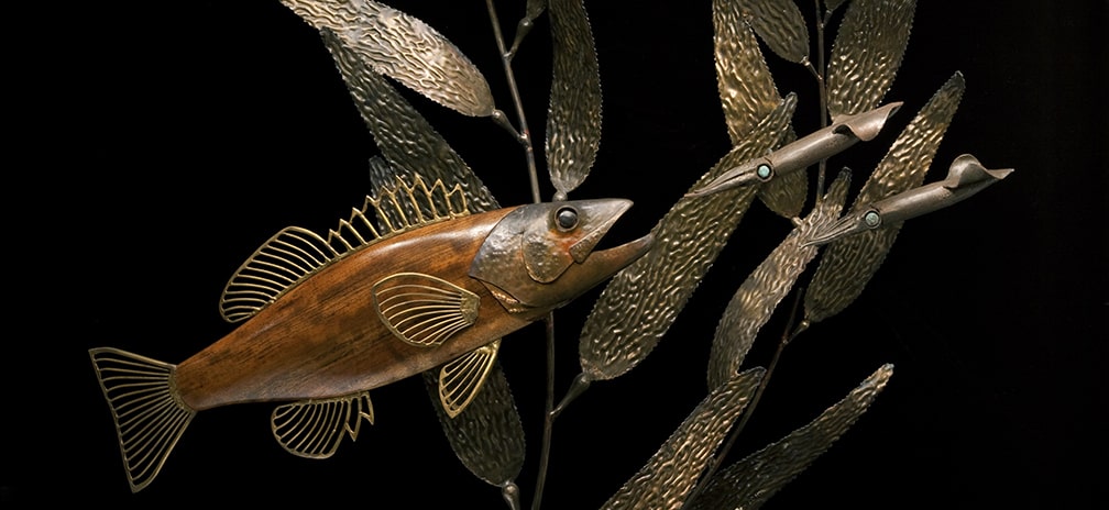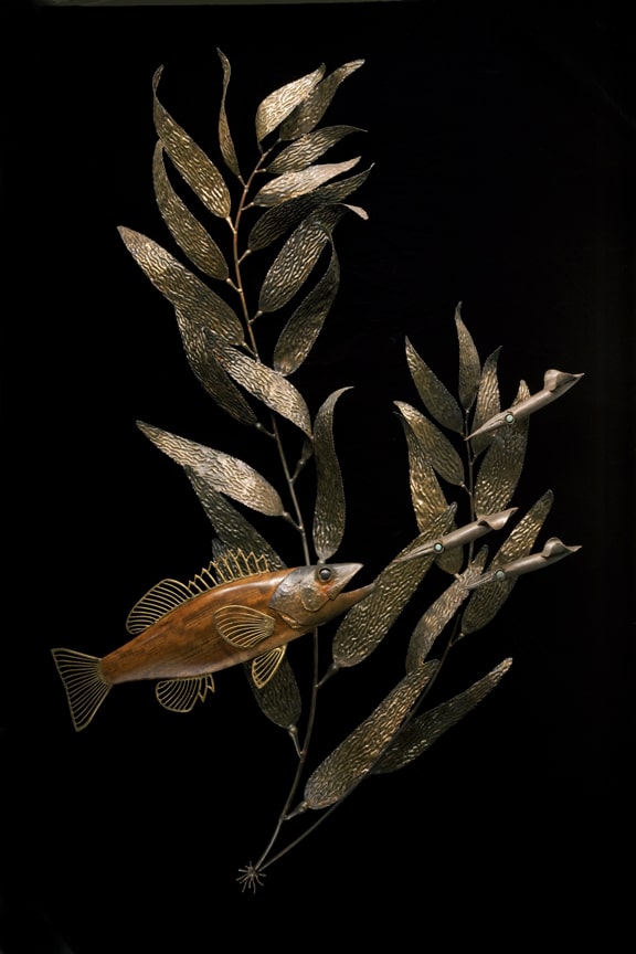 The Greek word trophic refers to an animal’s position in the food chain. The sculpture, Trophic, shows a calico bass chasing three squid through kelp. Clearly higher on the food chain, this fish is made of carved shedua wood. Its head and fins are bronze that has been forged, hammered, and welded. The squid are forged and welded out of steel, and the kelp is hammered and welded out of bronze. Each blade of kelp has been hammered to achieve the corrugated texture that kelp has in nature.