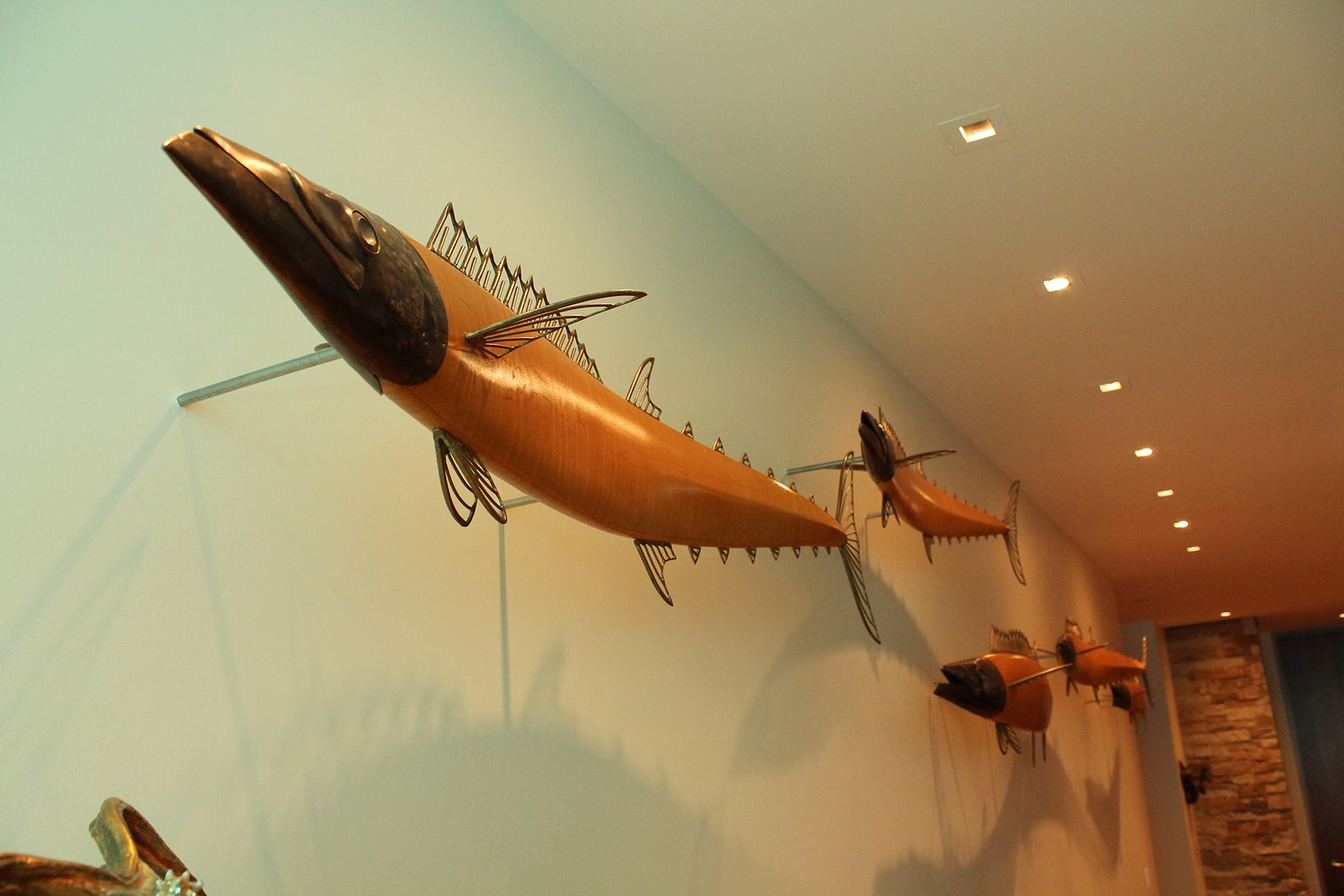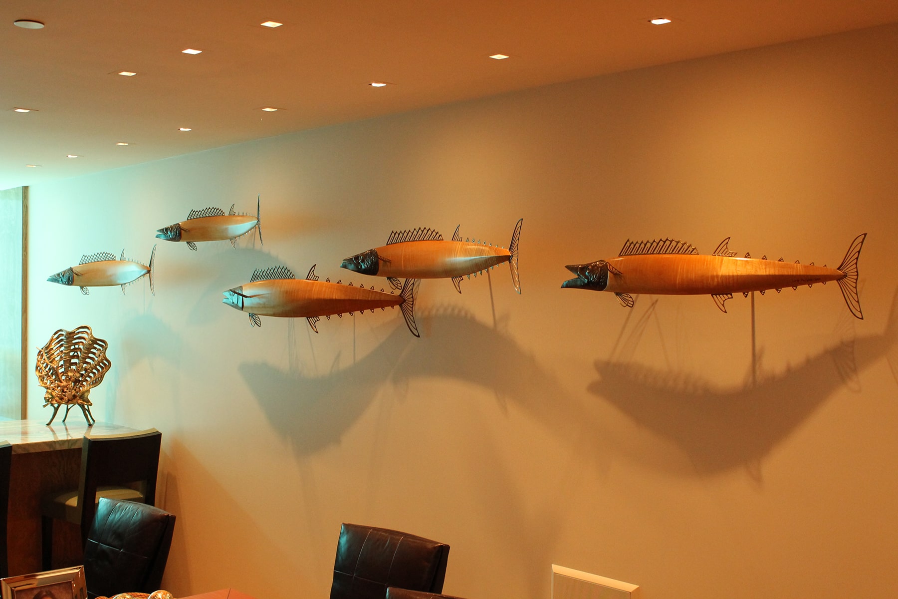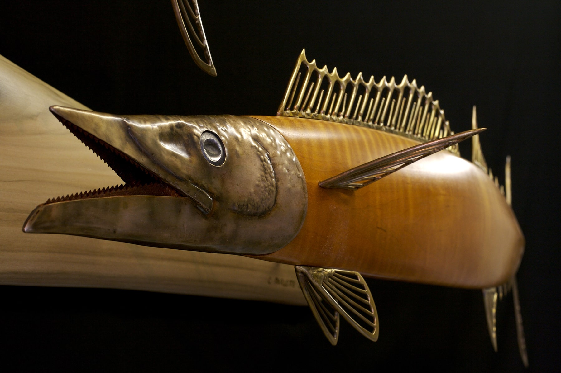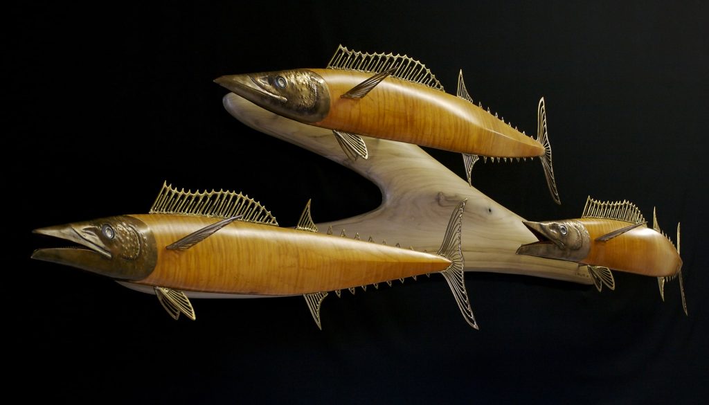 Wahoo captures the streamlined power and elegance of a fish that ranks among the fastest in the ocean. The bodies are curly redwood and curly maple because the wood’s tiger stripes match the bold striping of the fish. Capturing the curving path of these fish communicates their vitality. The head and fins are hammered and welded out of bronze, and saw blades serve as teeth. The eyes are steel, and recessed pieces of abalone serve as the pupils.