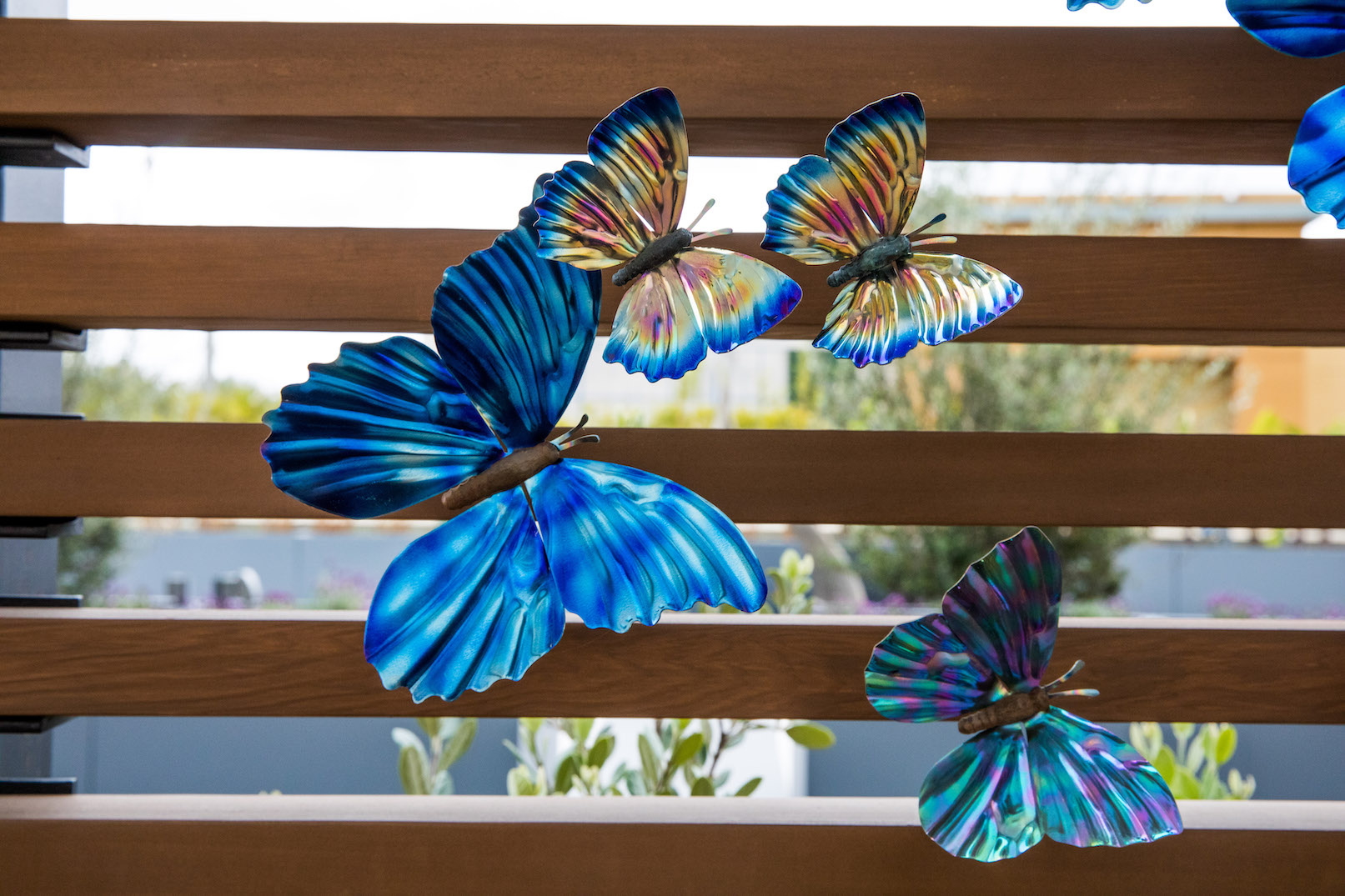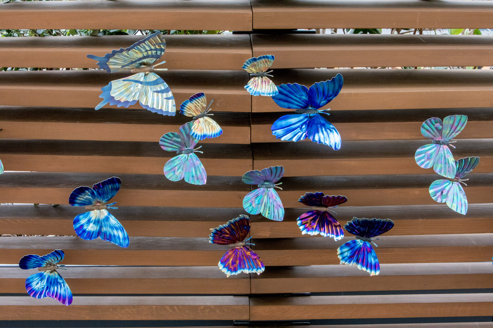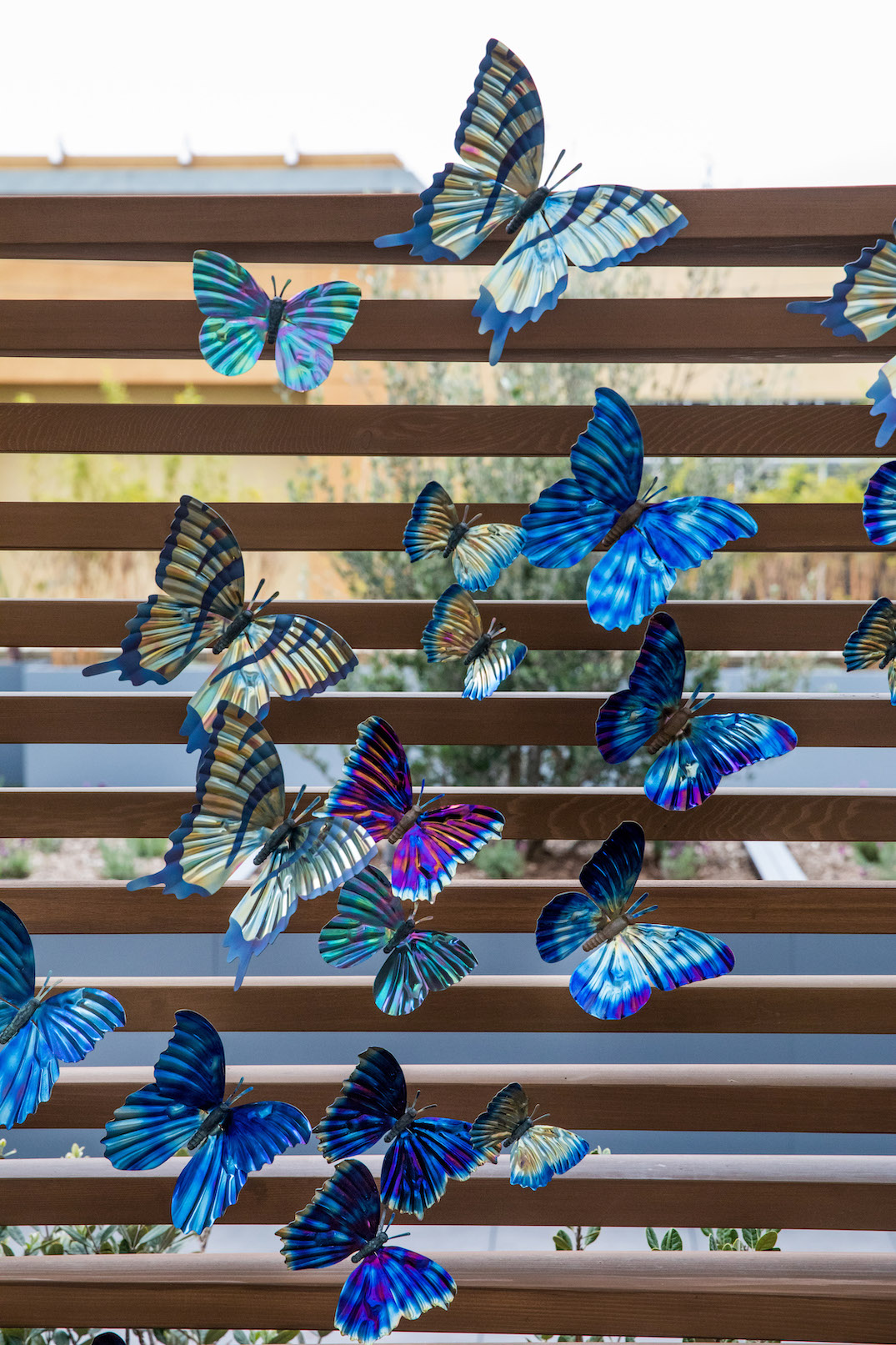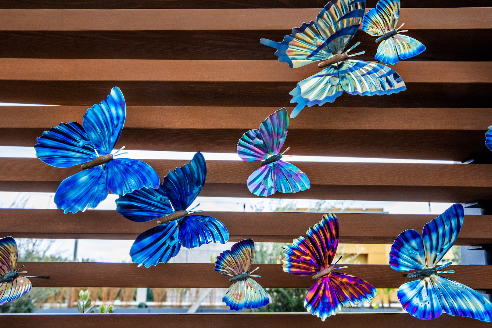 At nearly seventy feet long, Wings in the Wind creates a memorable moment for guests at the Marriott Gardens in Anaheim, California. The careful heating of the titanium wings brings to life the brilliant hue of each butterfly. Together, the hundreds of vivid blue butterflies form a breathtaking flow of color.