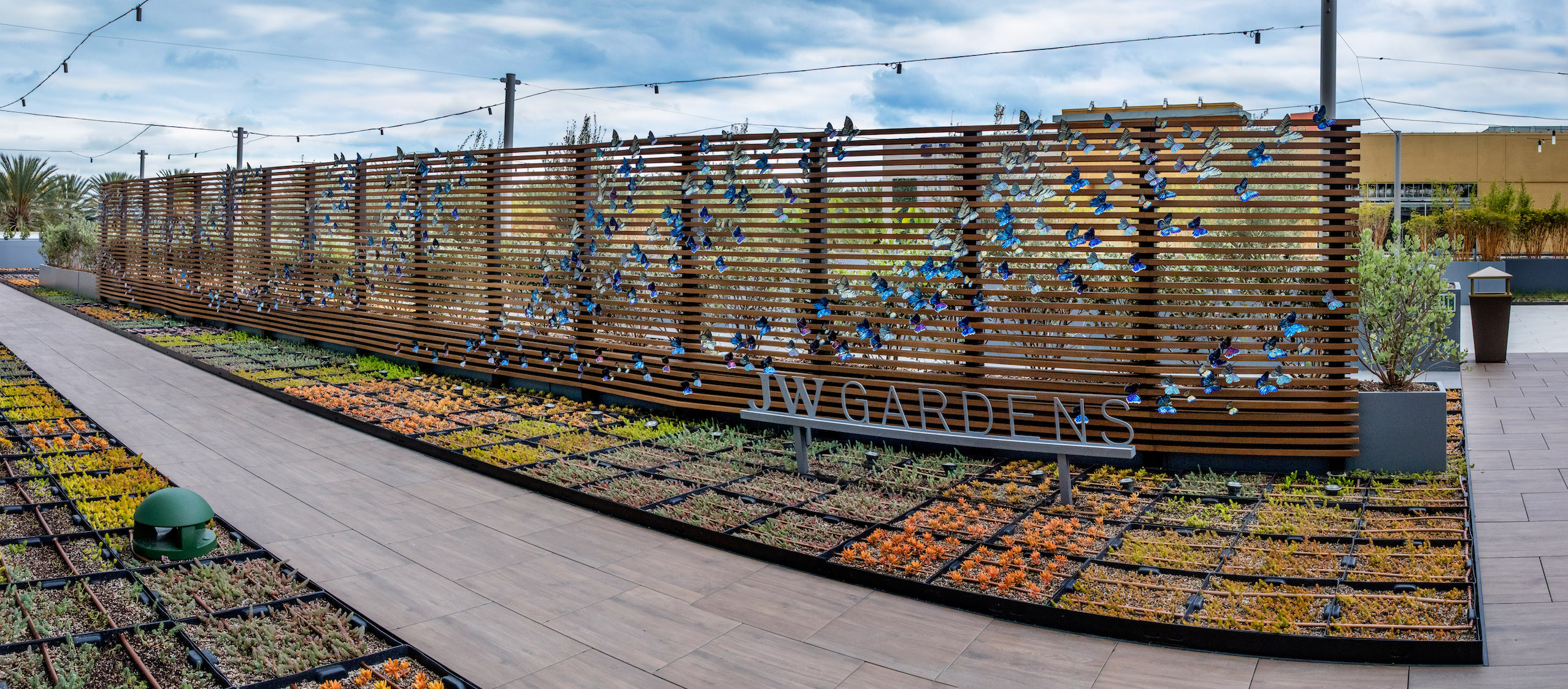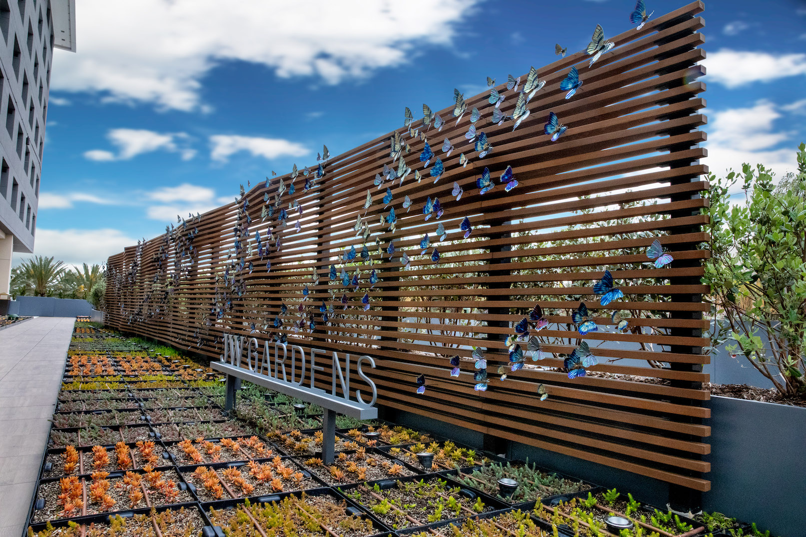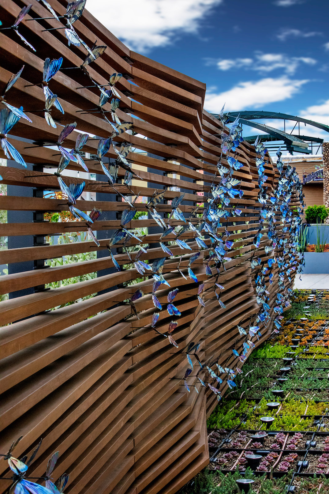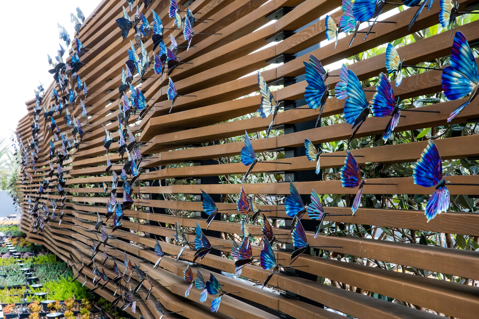 At nearly seventy feet long, Wings in the Wind creates a memorable moment for guests at the Marriott Gardens in Anaheim, California. The careful heating of the titanium wings brings to life the brilliant hue of each butterfly. Together, the hundreds of vivid blue butterflies form a breathtaking flow of color.