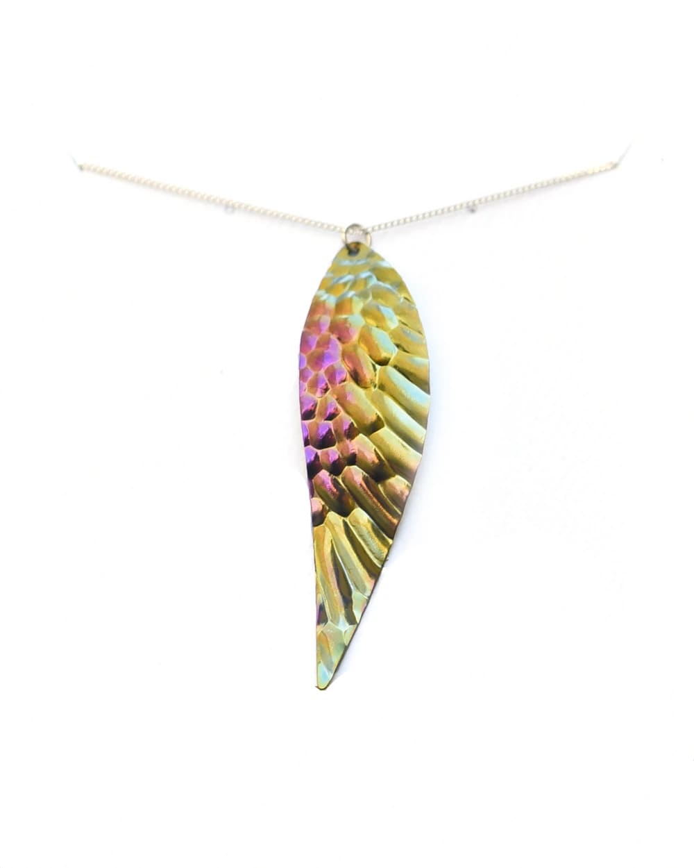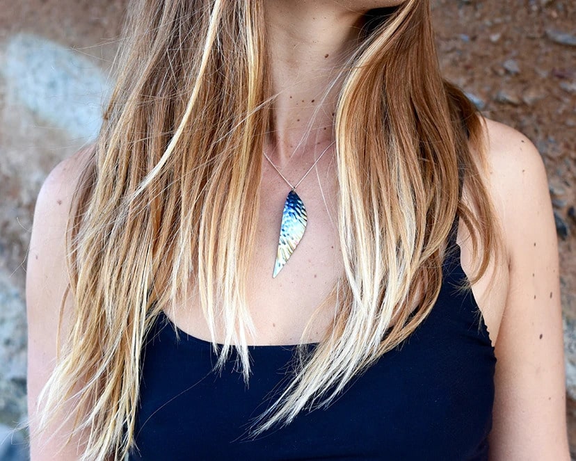 A dreamy piece that can be worn as standout jewelry for any occasion, the Wings necklace features a single wing, complete with handcrafted indentations resembling feathers. The uplifting necklace, which comes in 16”, 18” and 20” lengths on a sterling silver chain, has an inspiring spirit about it.